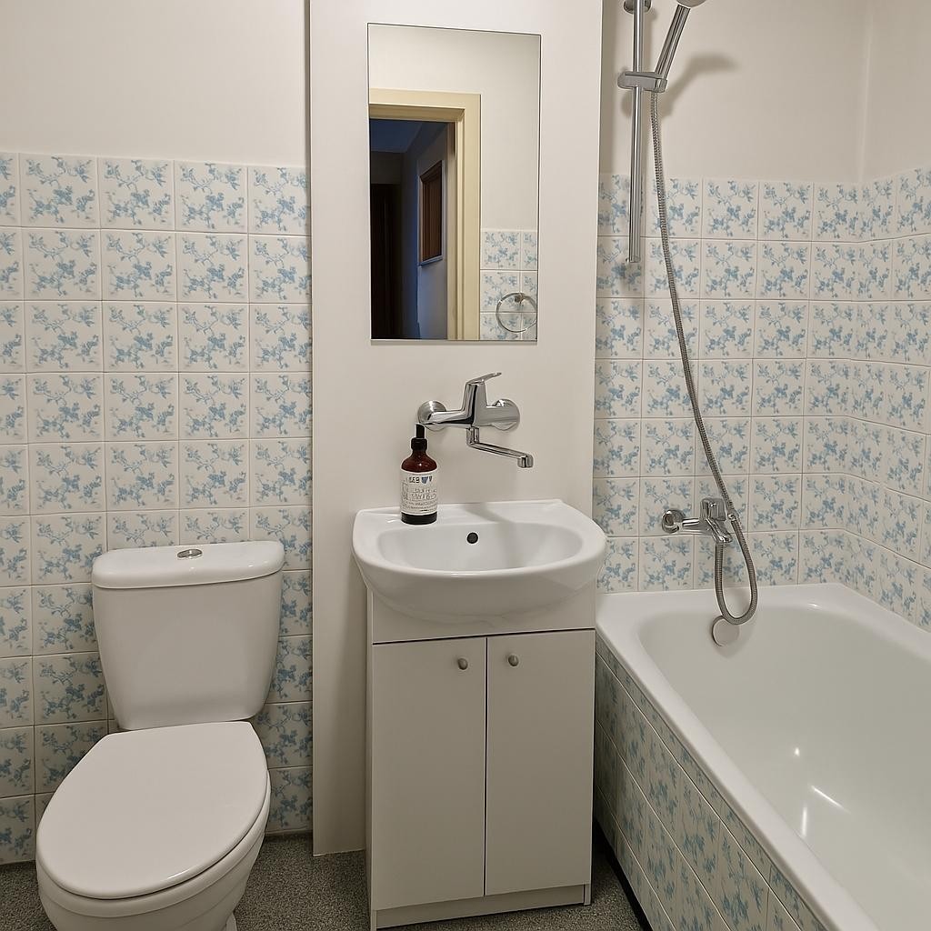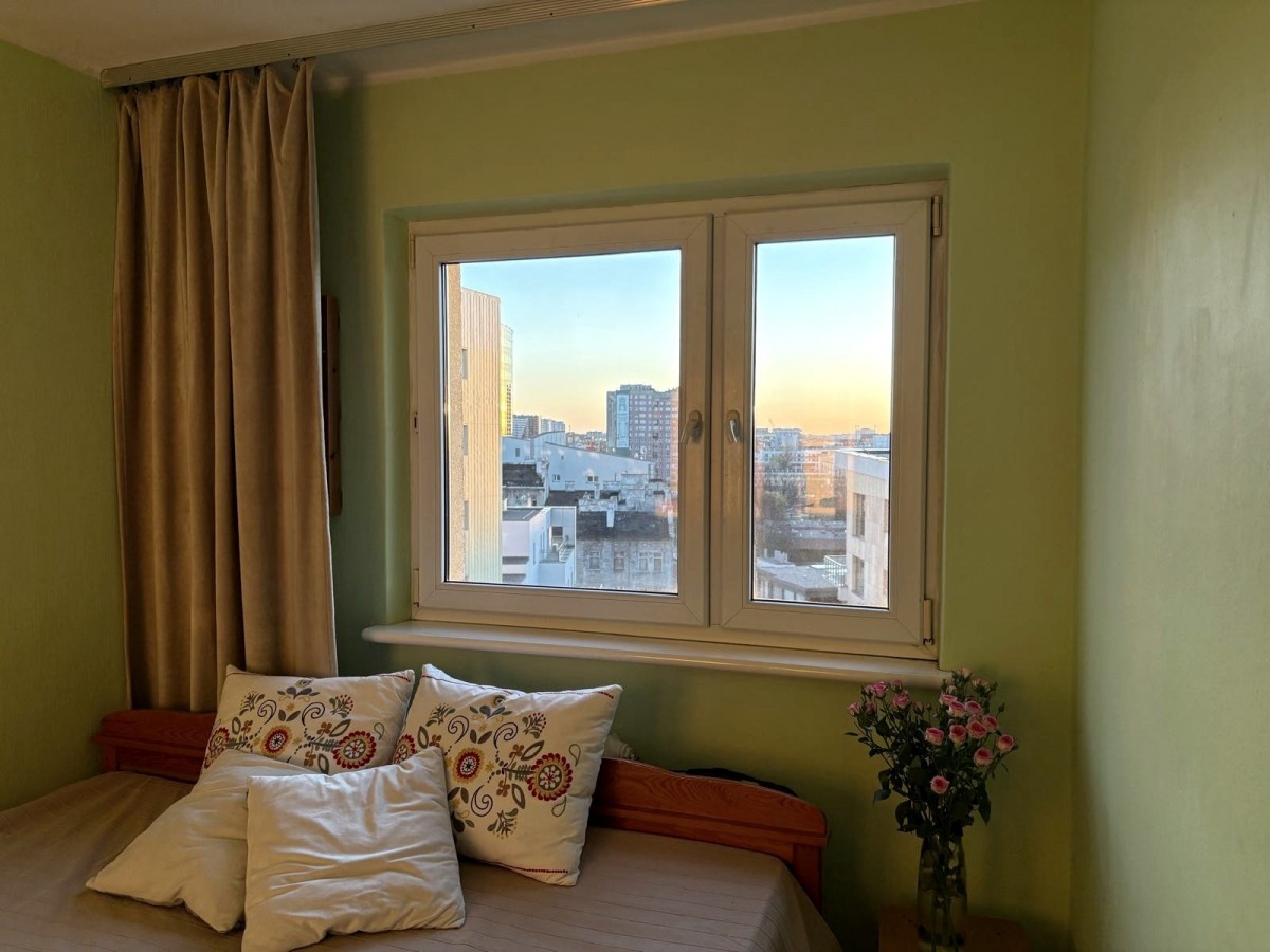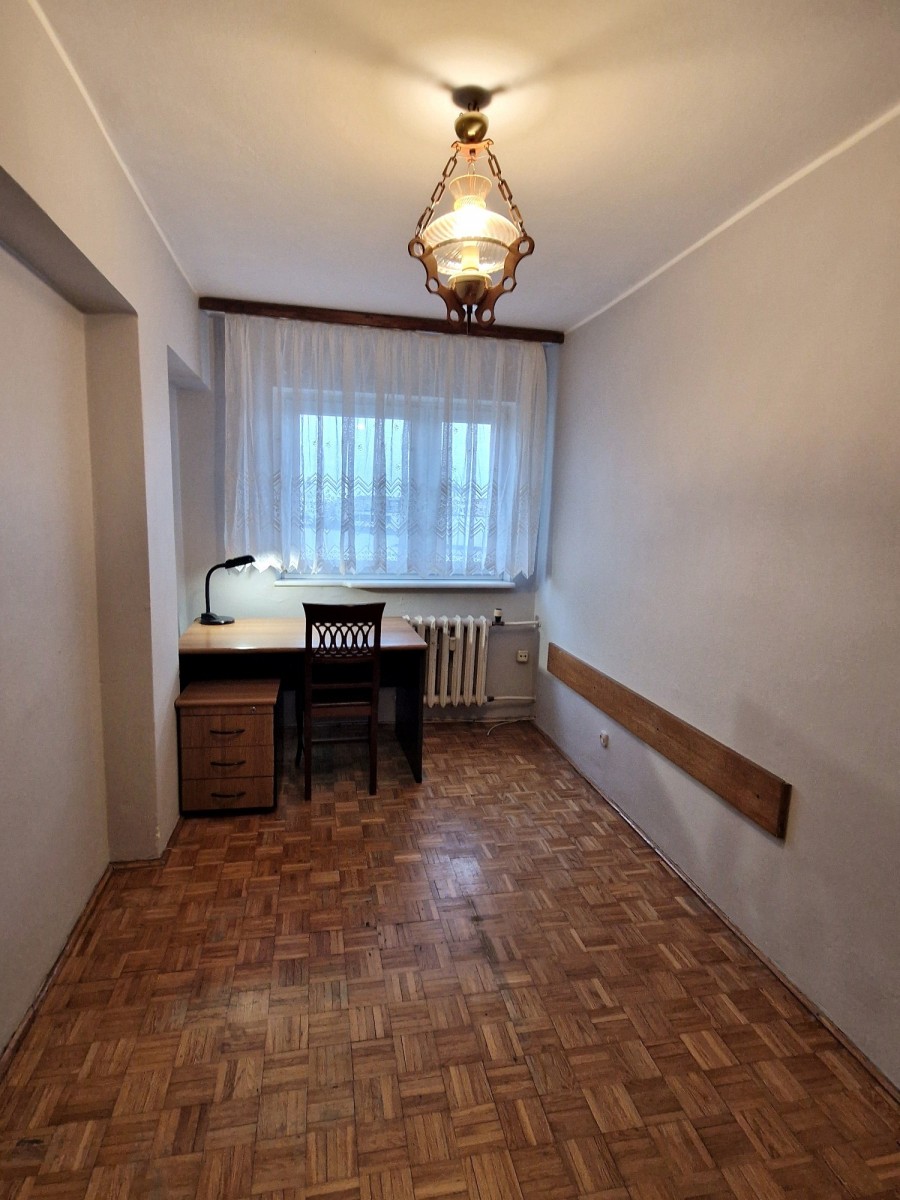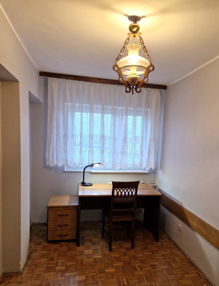 Lokal widny, rozkładowy - do wszystkich pomieszczeń bezpośredni dostęp z obszernego przedpokoju z miejscem na dwie szafy wnękowe. Pokoje 19, 10 i 9 mkw., kuchnia 6 mkw. z oknem - możliwość łatwego otwarcia i połączenia z przylegającym salonem . Z pokoju dziennego wyjście na niewielki balkon po stronie zachodniej, z widokiem na biznesowe centrum. Na podłogach w pokojach mozaika parkietowa, w kuchni i łazience terakota. Mieszkanie wymaga remontu lub odświeżenia. Do lokalu przynależy piwnica.