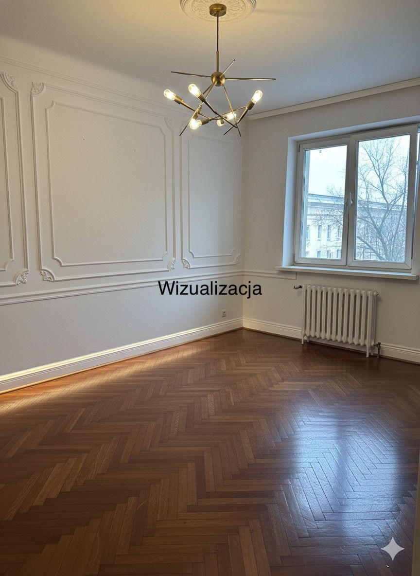 Duże okna wychodzą na Aleję Solidarności oraz na zielone, ciche podwórze, dzięki czemu mieszkanie jest doskonale doświetlone przez cały dzień. Na podłogach zachował się oryginalny parkiet.