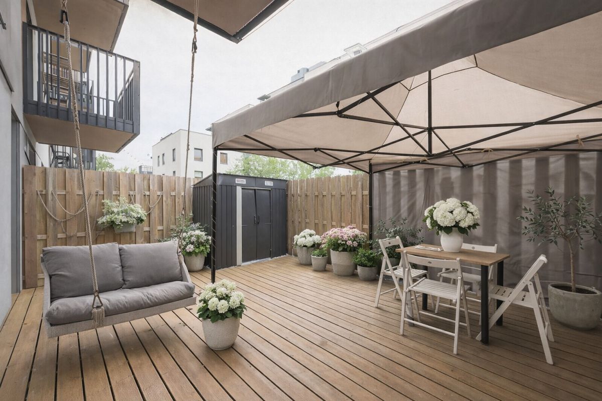 Zarówno z salonu, jak i z sypialni prowadzi bezpośrednie wyjście do prywatnego tarasu o powierzchni ok. 30 m². Ogródek został wyłożony naturalnym drewnem i wyposażony w domek narzędziowy oraz pawilon ogrodowy — to idealna przestrzeń do wypoczynku na świeżym powietrzu.