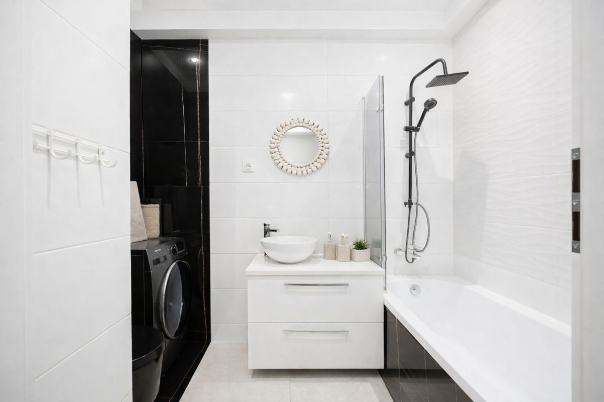 Łazienka z wanną z prysznicem, pralko-suszarką oraz zabudową meblową.