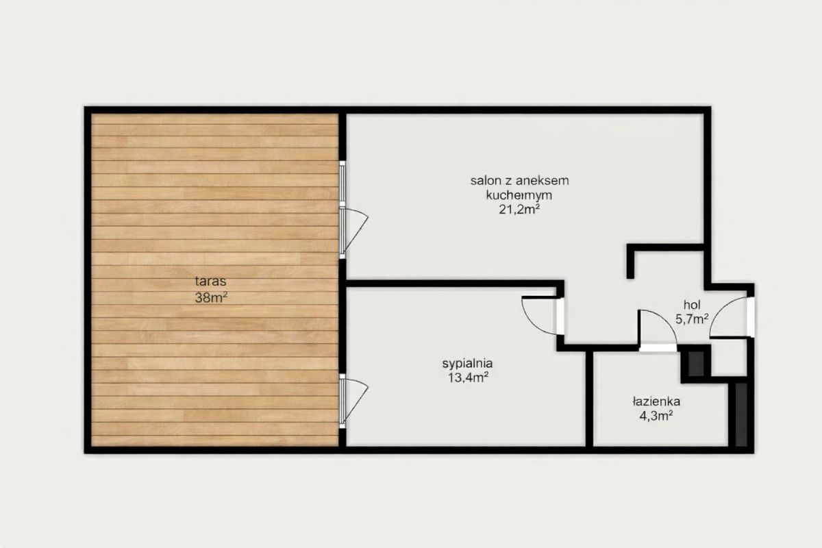 • przestronnego salonu z aneksem kuchennym (21,20 m²),
