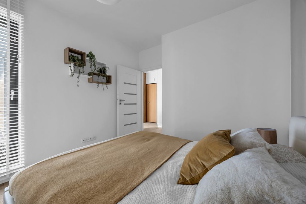 Sypialnia (11,68 m²) to komfortowa przestrzeń do odpoczynku – z dużą szafą w zabudowie oraz łóżkiem 160x200 ze schowkiem, co znacząco zwiększa możliwości przechowywania.