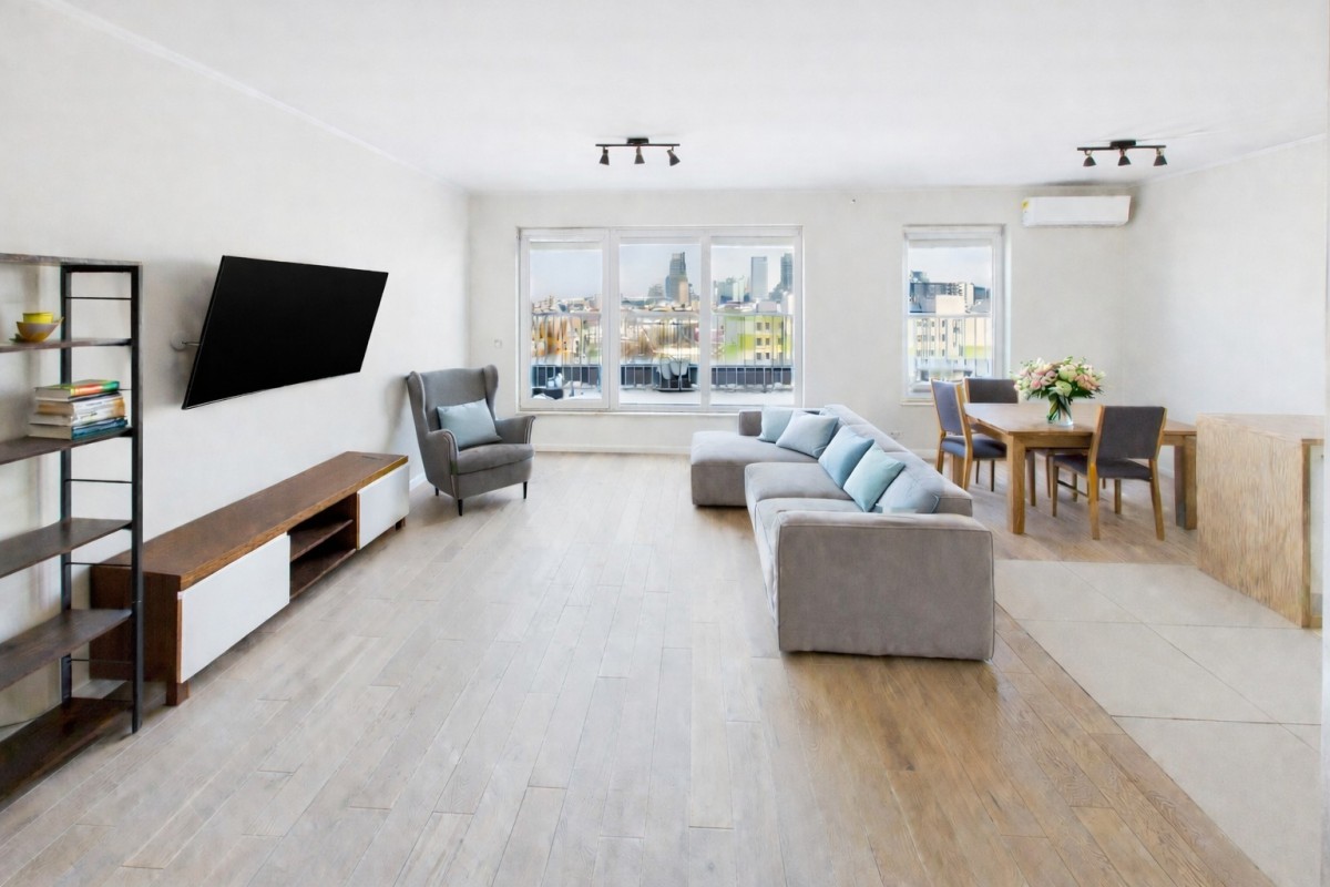 Mieszkanie wyróżnia się funkcjonalnym układem, bardzo dobrym doświetleniem oraz otwartą panoramą Warszawy widoczną z okien, zapewniającą poczucie przestrzeni i prywatności niedostępne na niższych kondygnacjach.