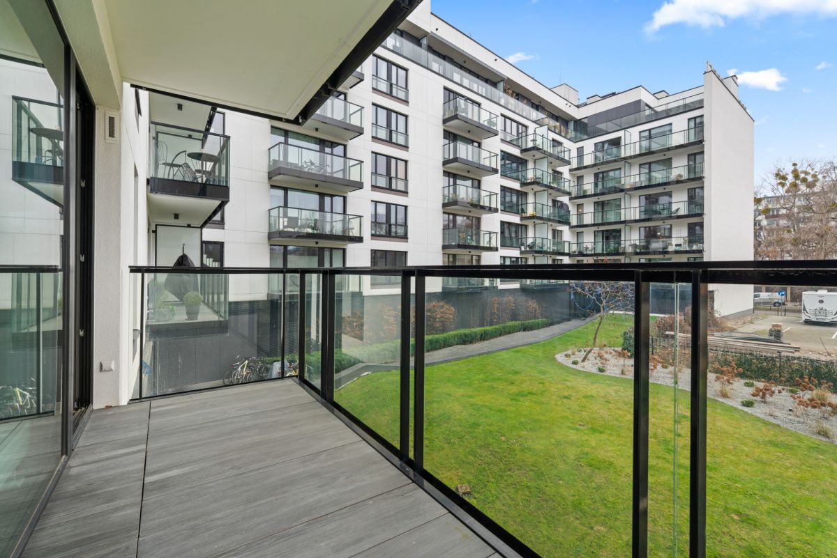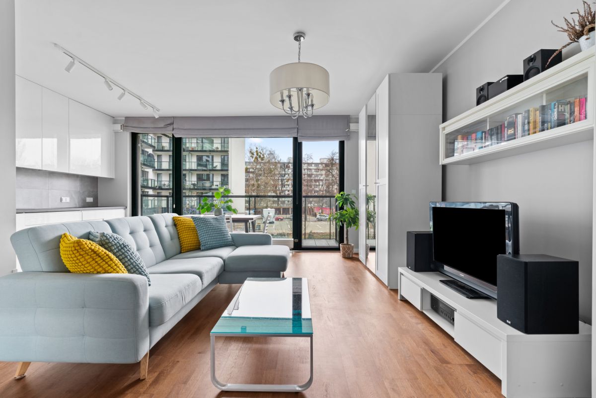 Mieszkanie jest w pełni umeblowane i gotowe do zamieszkania. Składa się z jasnego salonu z aneksem kuchennym, sypialni, łazienki oraz loggii z ekspozycją zachodnią i widokiem na wewnętrzne patio. Funkcjonalny układ, dębowa podłoga, kuchnia na wymiar ze sprzętem AGD.