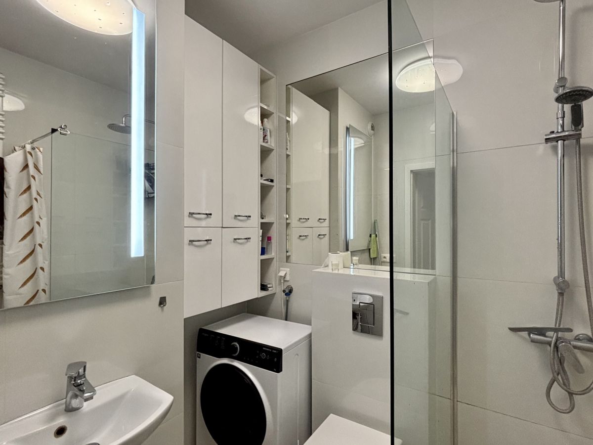 Duże, panoramiczne okno zapewnia doskonałe doświetlenie wnętrza przez cały dzień. W skład mieszkania wchodzi również łazienka z kabiną prysznicową.
