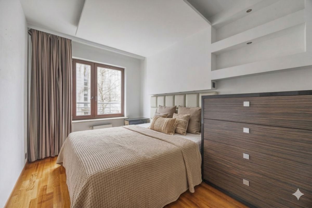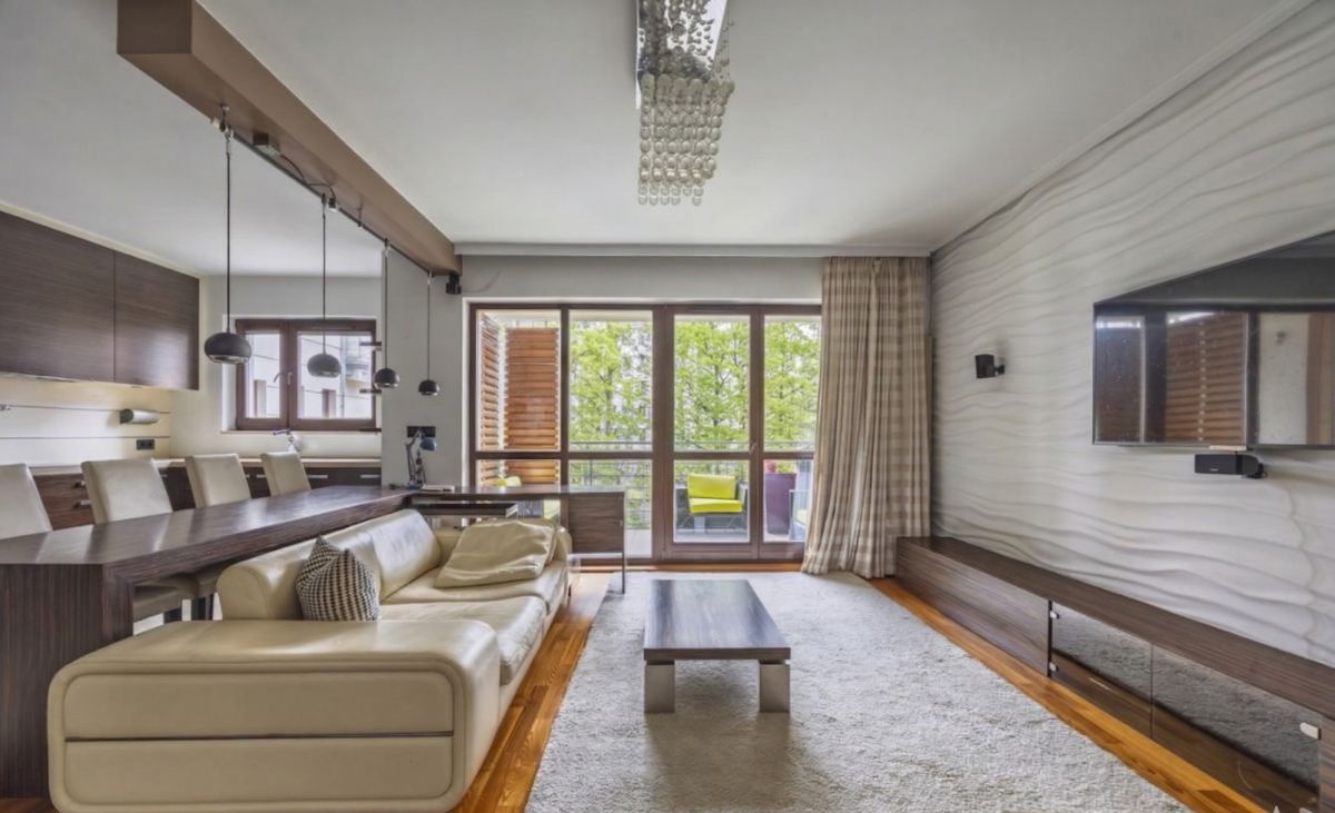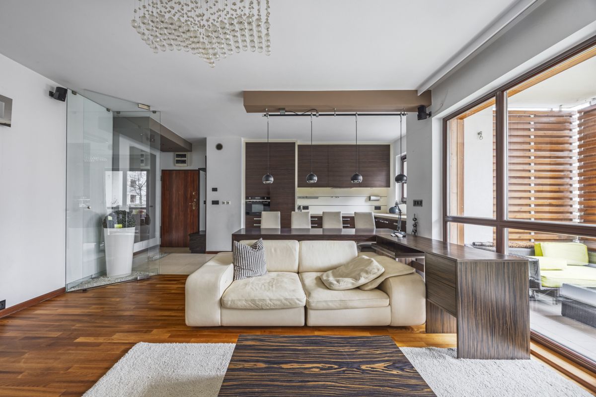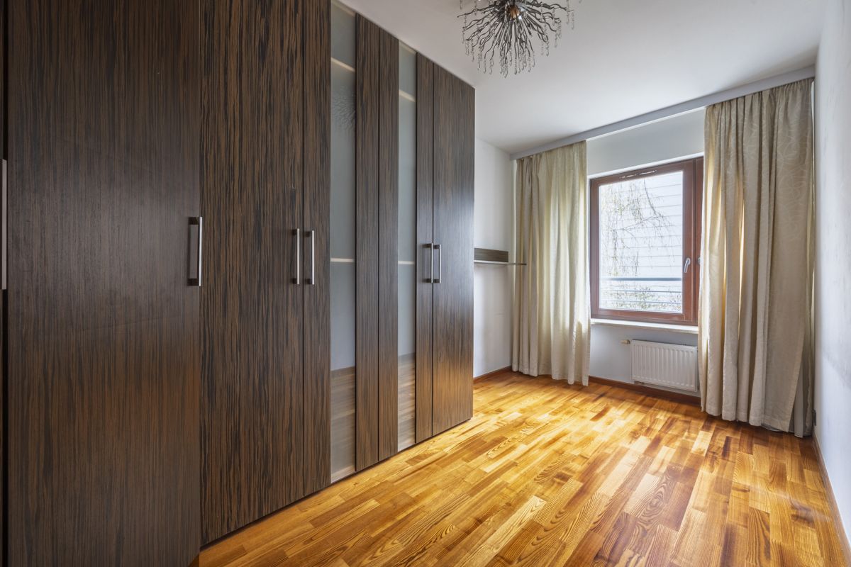 W całym mieszkaniu jest ogrzewanie podłogowe. Funkcjonalne meble w zabudowie na wymiar, podobnie jak cala zabudowa kuchni są eleganckie i w doskonałym stanie. Podłogi są wykonane drewna jesionu i ponadczasowego, jasnego gresu. Klasyczna sofa skórzana marki PATT dopełniają jakości wnętrza.