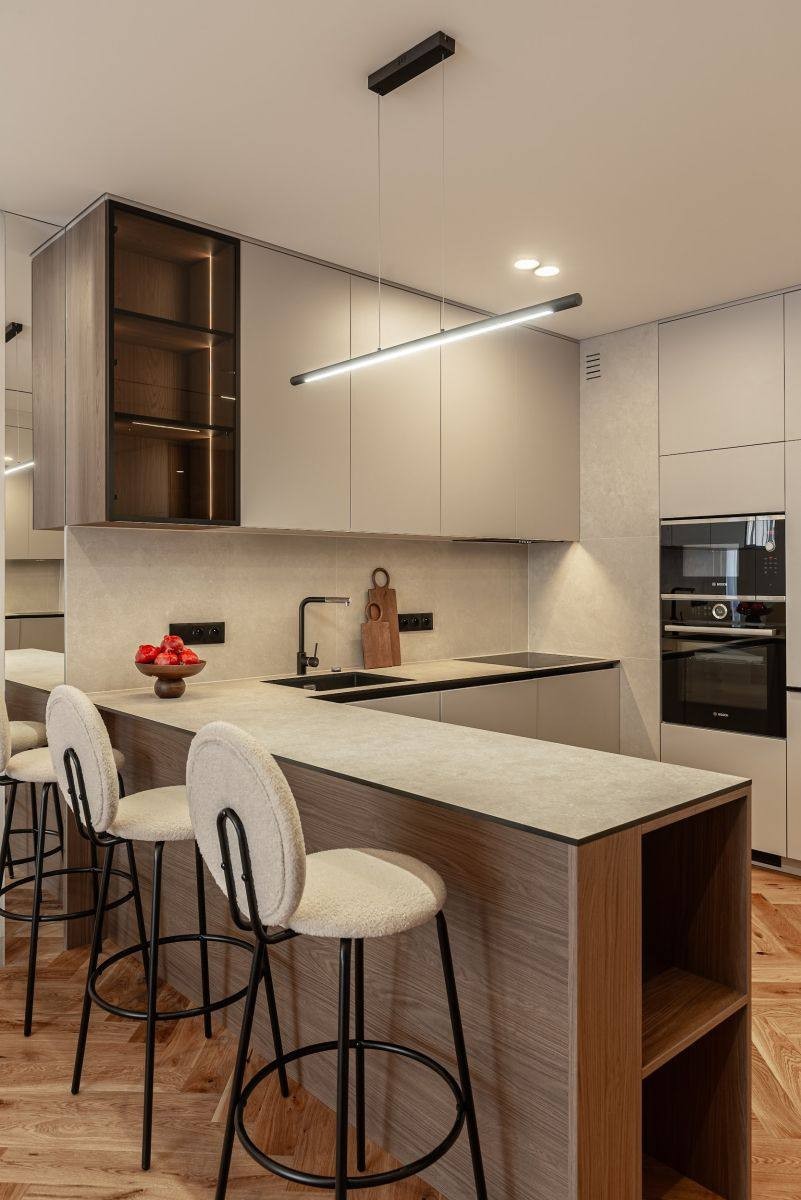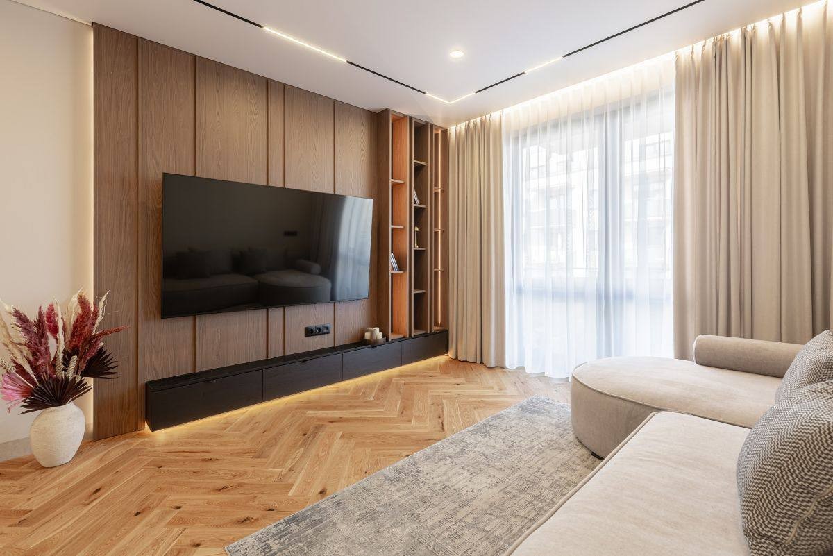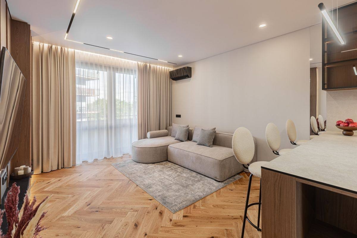 - salon z aneksem kuchennym 27 m² i wyjściem na loggię 8 m² - jasny, przestronny, idealny do spotkań i odpoczynku