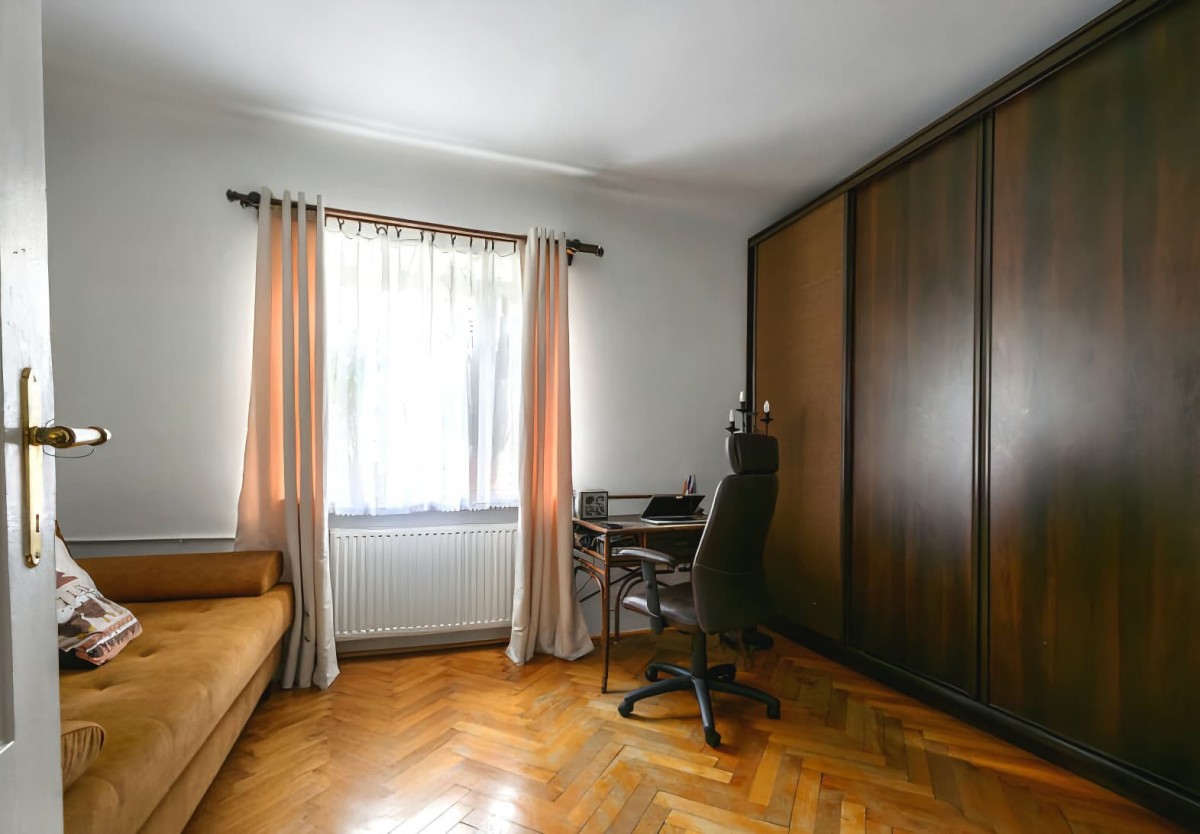- sypialnia z bardzo dużą, funkcjonalną szafą garderobianą w zabudowie, drewnianym parkietem, drewniane okno i parapet,