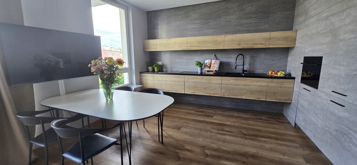 Salon z aneksem kuchennym - duża, jasna przestrzeń dzienna z dostępem do naturalnego światła. W pełni wyposażona kuchnia z zabudową i sprzętami AGD (lodówka, zmywarka, piekarnik, płyta indukcyjna).