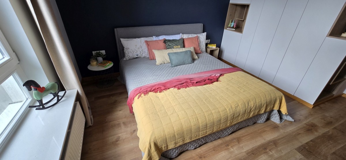Sypialnia główna - wygodne łóżko, szafa, spokojna przestrzeń zapewniająca prywatność i komfort.