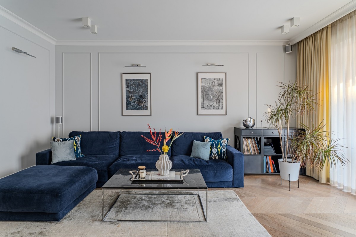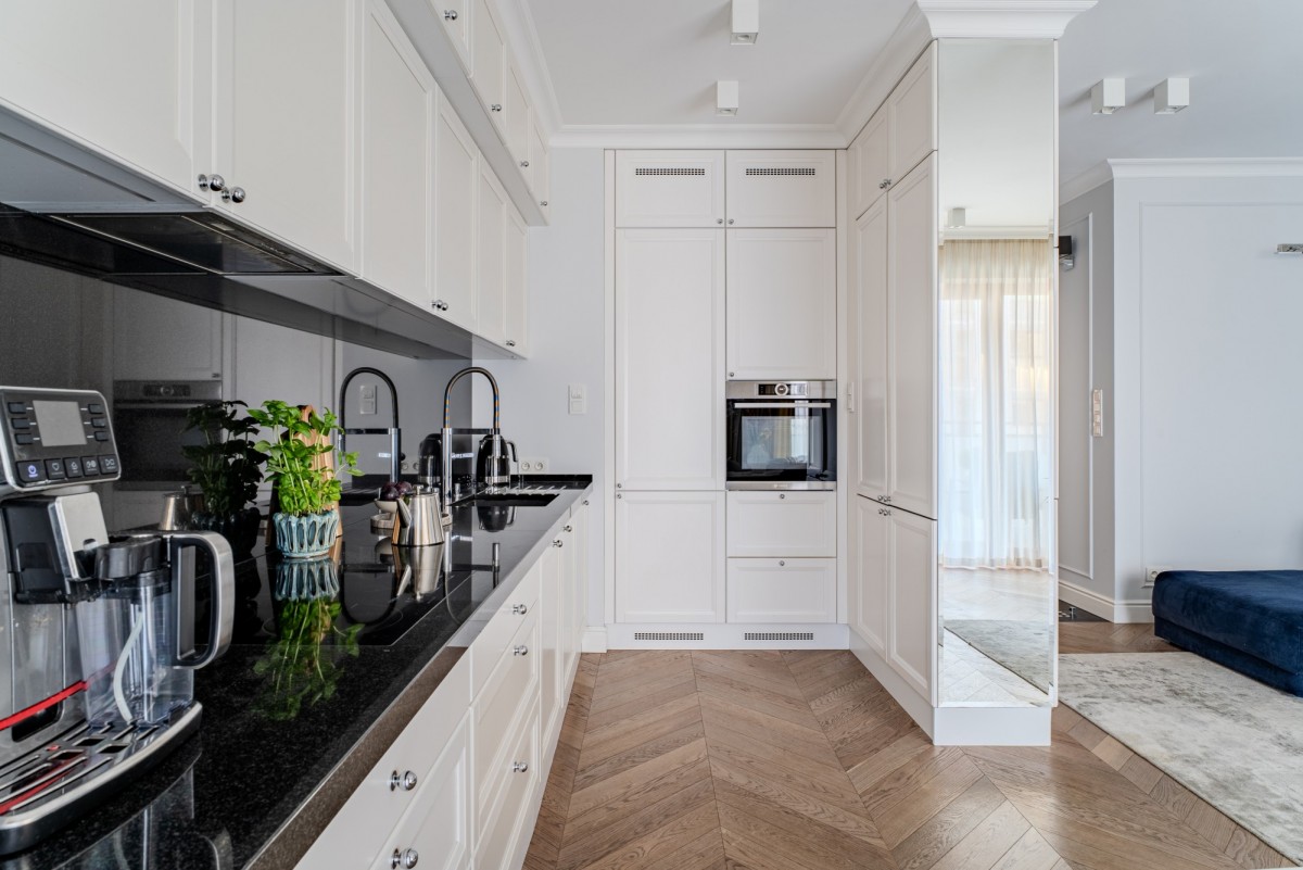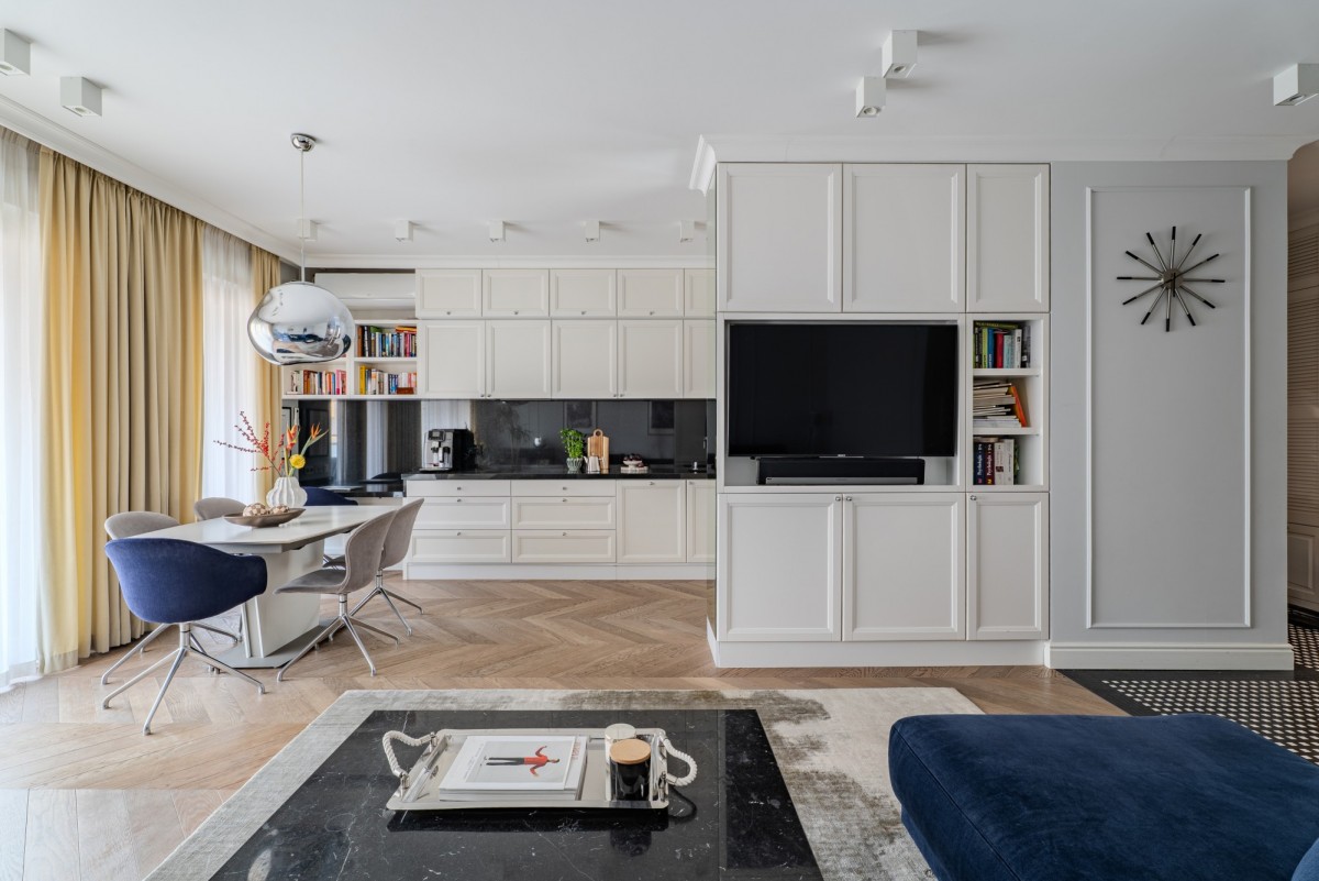 Większość mebli w mieszkaniu została wykonana na wymiar, dzięki czemu wnętrze jest bardzo eleganckie oraz jest dużo przestrzeni do przechowywania.