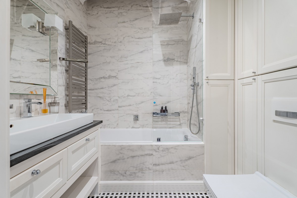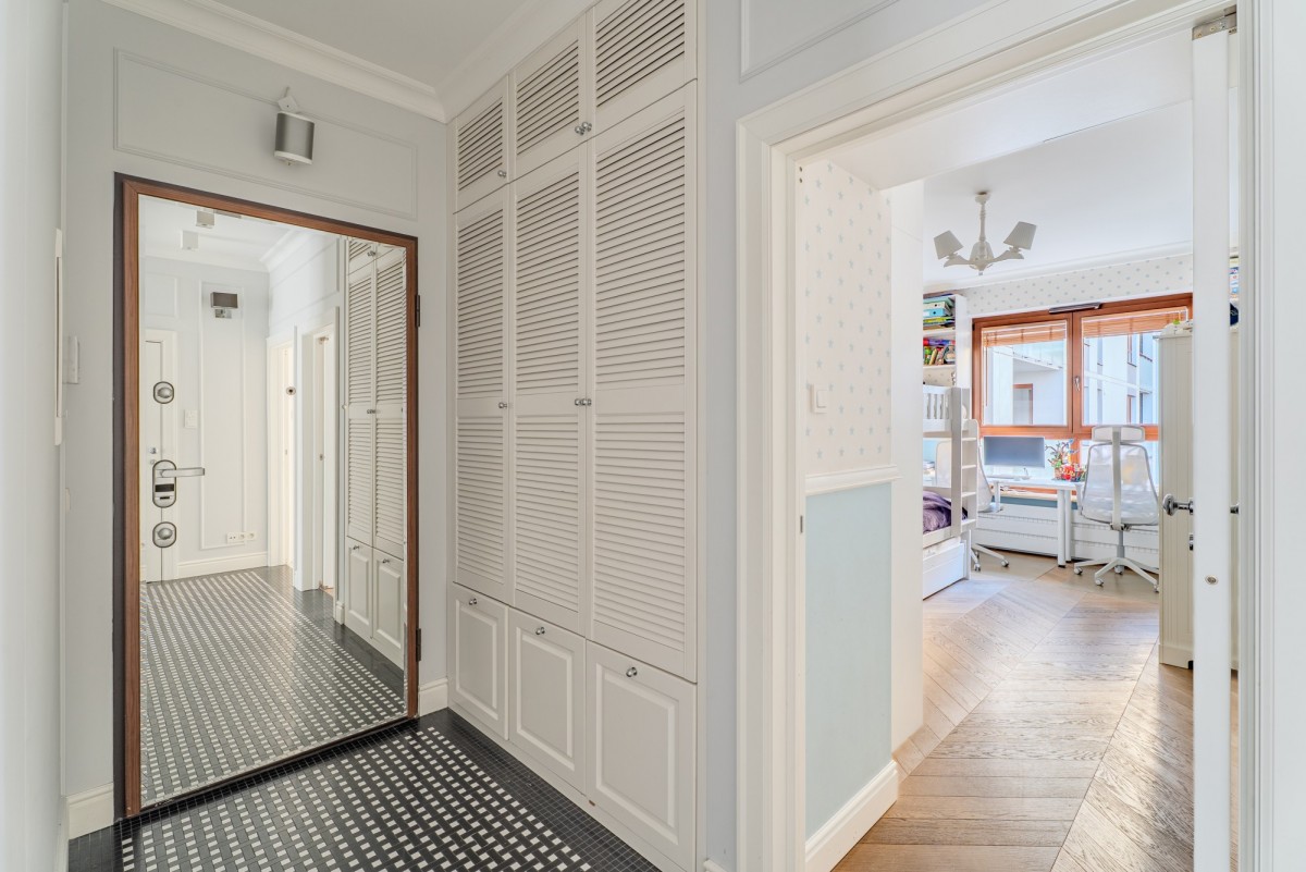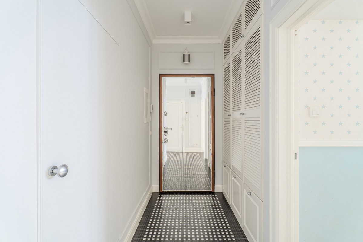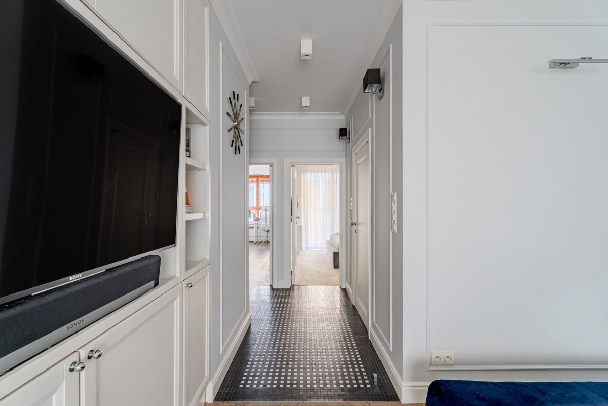 Większość mebli w mieszkaniu została wykonana na wymiar, dzięki czemu wnętrze jest bardzo eleganckie oraz jest dużo przestrzeni do przechowywania.