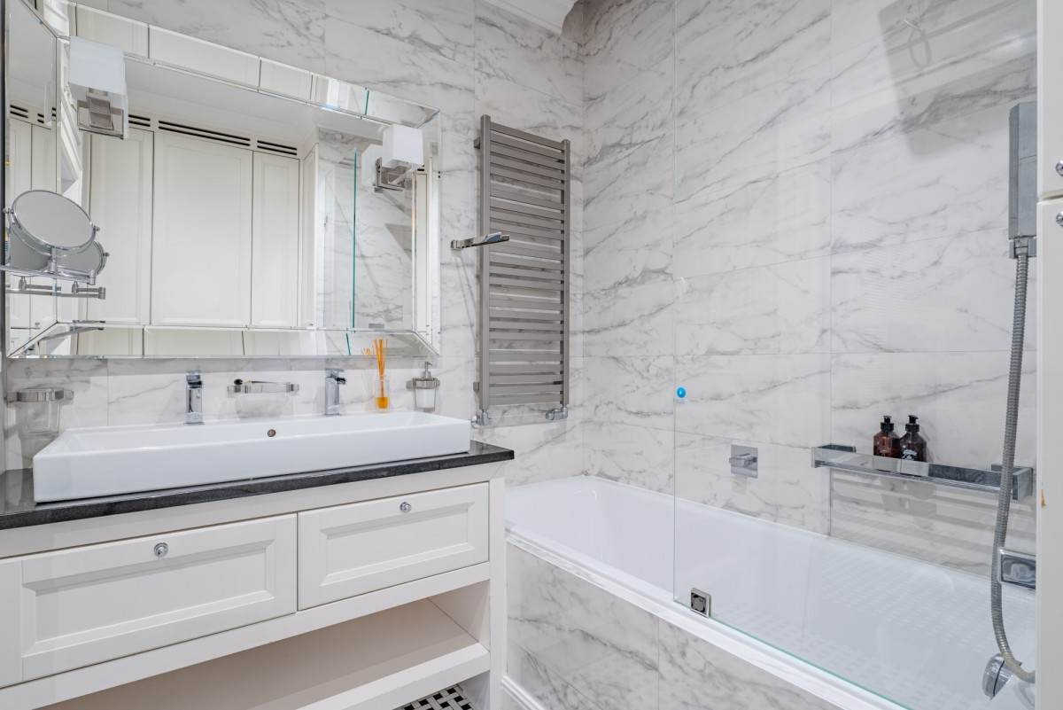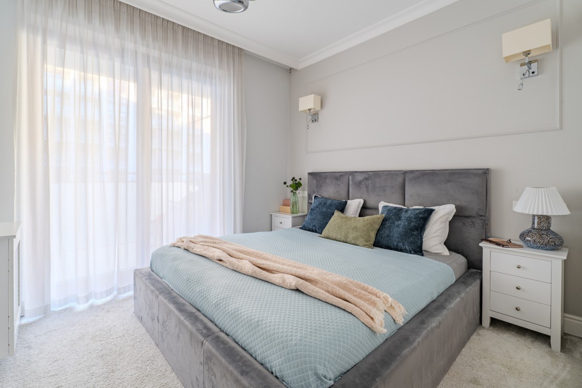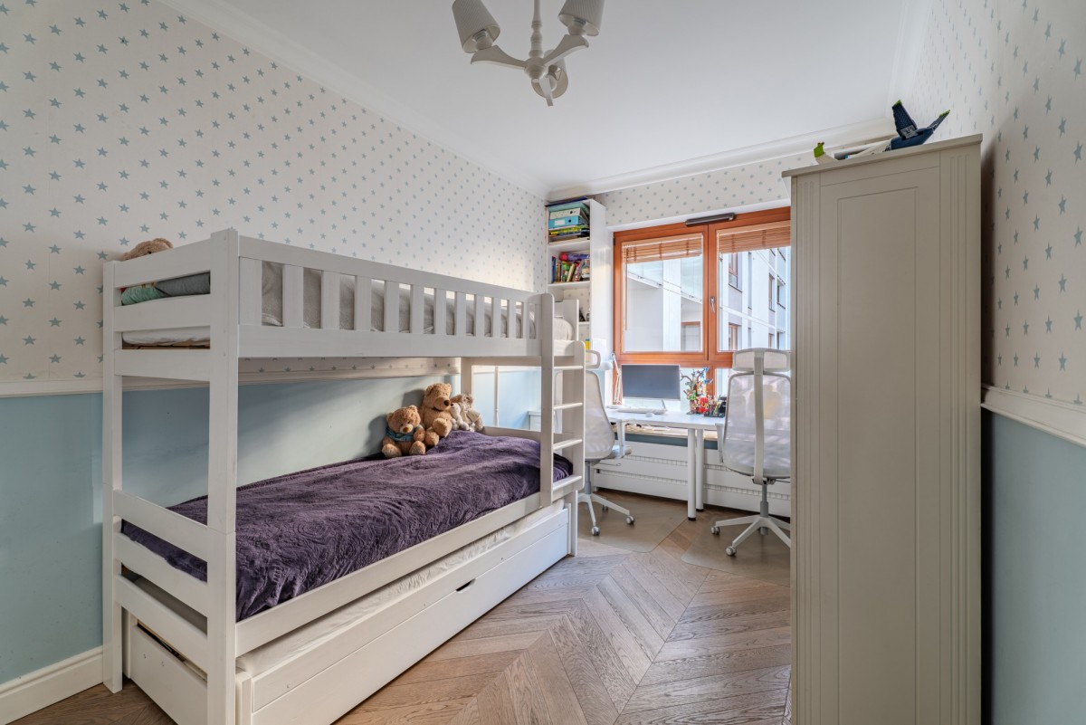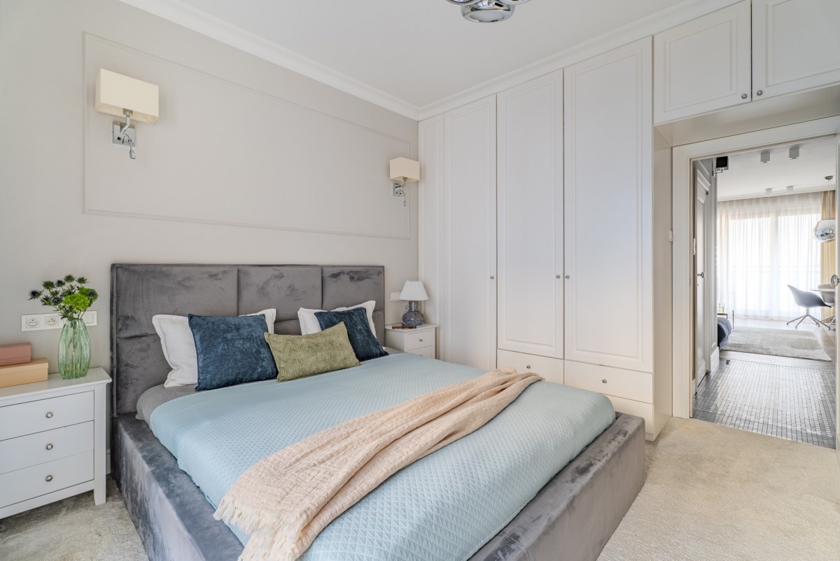Nieruchomość jest urządzona w bardzo eleganckim, klasycznym stylu z dużą dbałością o detale, a użyte do jej wykończenia materiały są najwyższej jakości. Blaty w kuchni i łazience wykonane zostały z granitu. Na podłodze w salonie i mniejszej sypialni znajduje się dębowy parkiet ułożony w jodełkę, w przedpokoju i łazience- ceramiczna mozaika, a w głównej sypialni- elegancka wykładzina. W mieszkaniu znajduje się dużo punktów oświetleniowych, które budują przytulny klimat wnętrza.