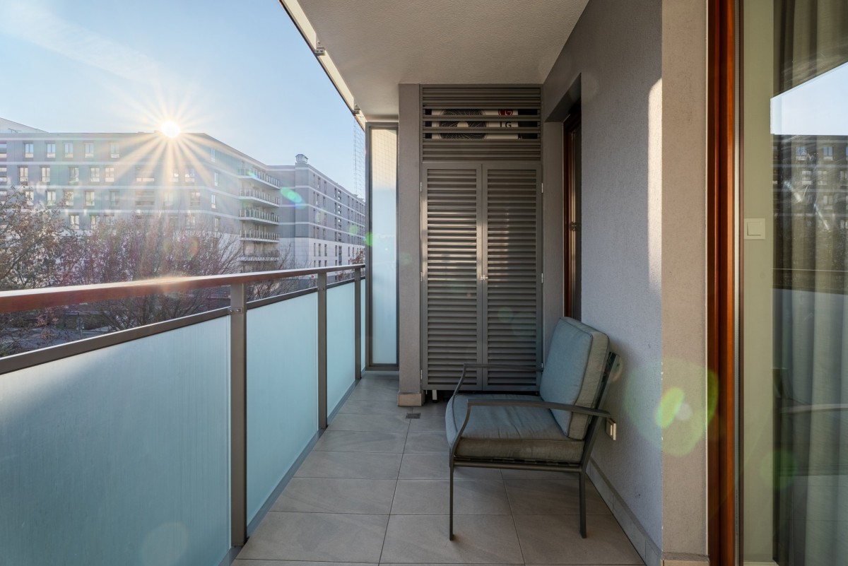Z salonu wyjdziemy na przestronną loggię (10,4 m2) z ekspozycją na wschodnią stronę świata, natomiast z głównej sypialni na nieco mniejszą loggię (4,7 m2) z ekspozycją na zachodnią stronę świata.