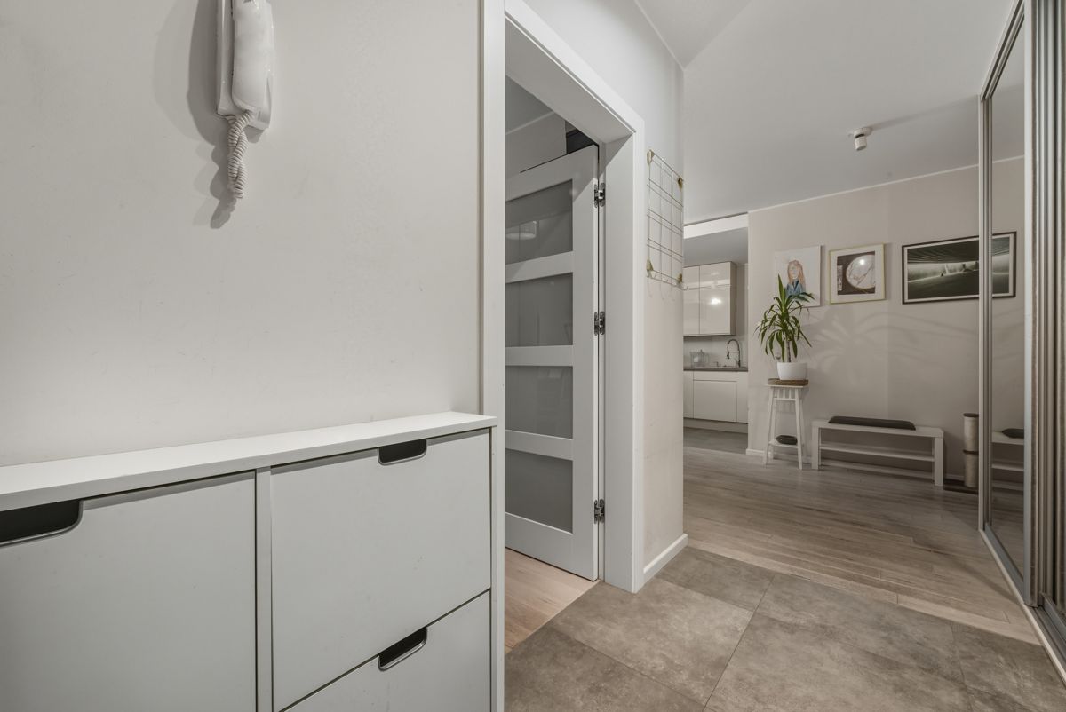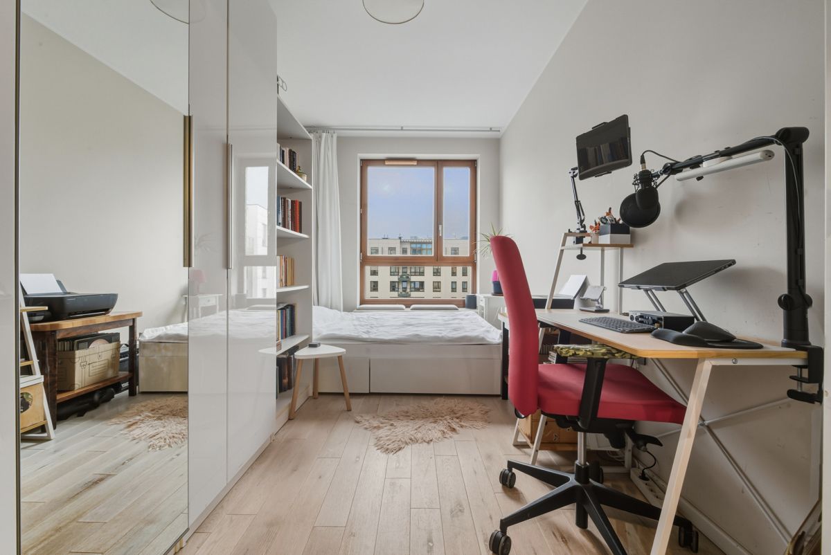 The apartment is situated on the 5th floor of a 6-story apartment building from 2014, in the intimate "Atelier Żoliborz" estate. The building is finished to a good standard, well-maintained, and secure - equipped with a modern elevator, monitoring, and security. Quiet and cozy - only 3 apartments per floor. Well-kept and nicely landscaped common areas and outdoor space between buildings. The apartment is very bright thanks to large windows with east/west exposure. The functional layout ensures comfort and privacy for residents.