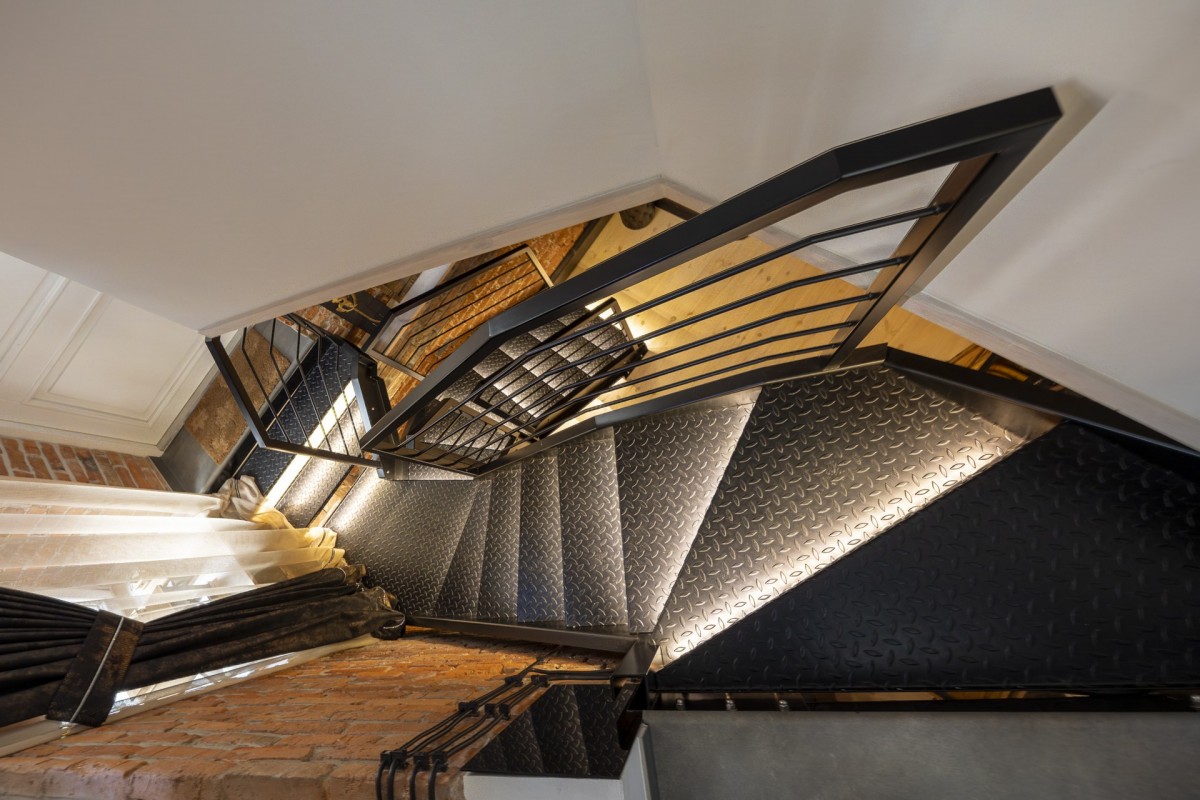 Schody: Wykonane na zamówienie, metalowe, malowane proszkowo na czarno.