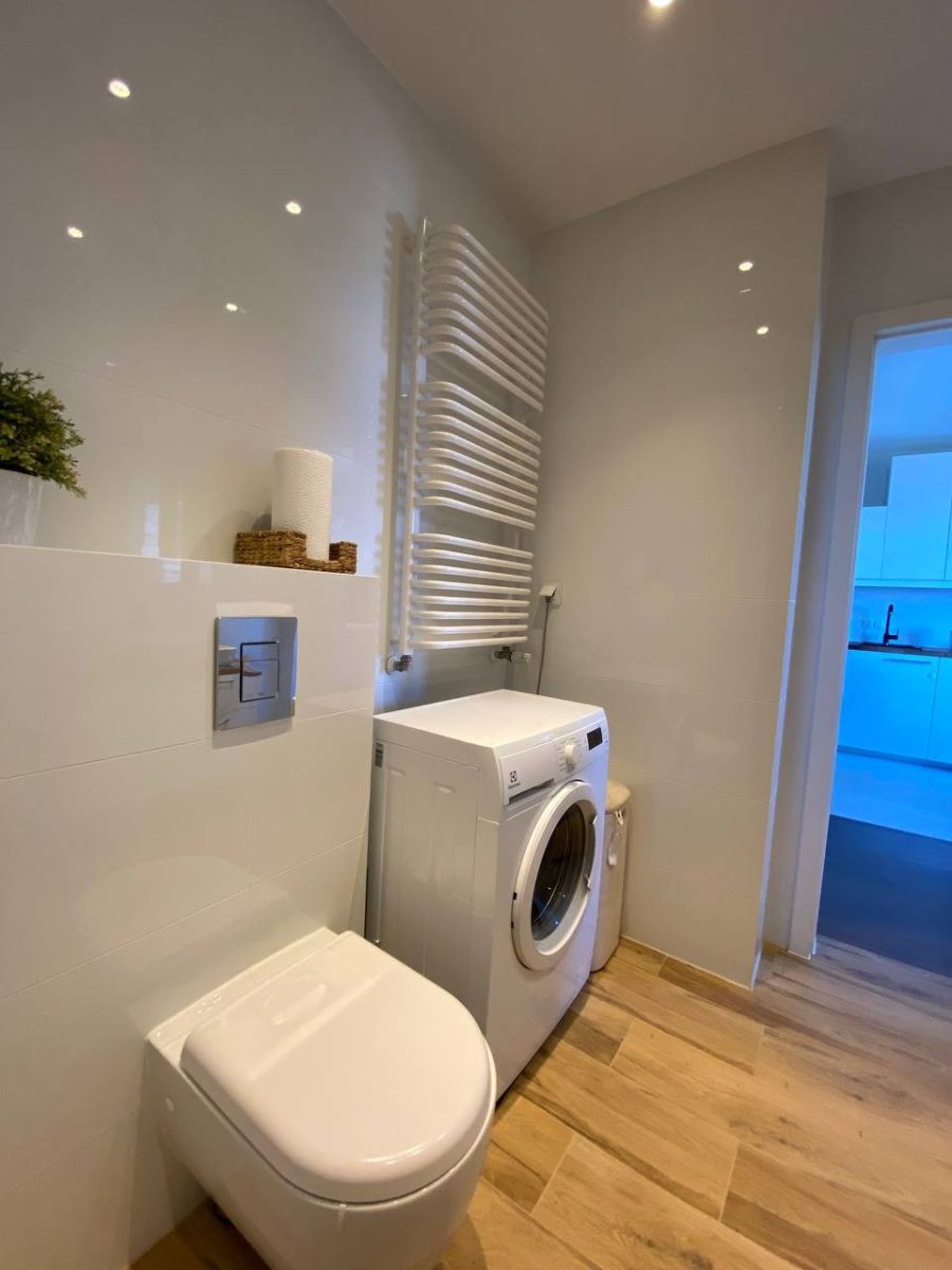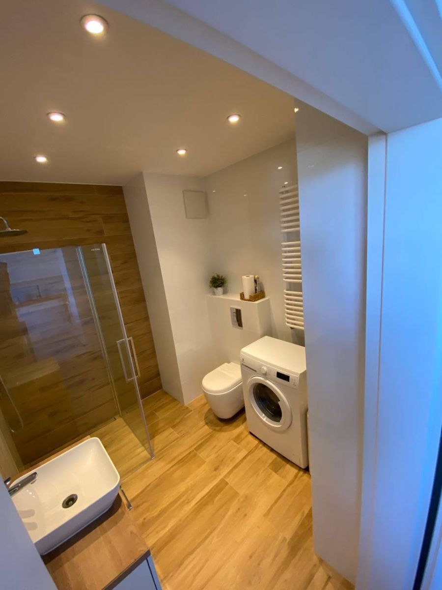 • łazienka z prysznicem i pralką.