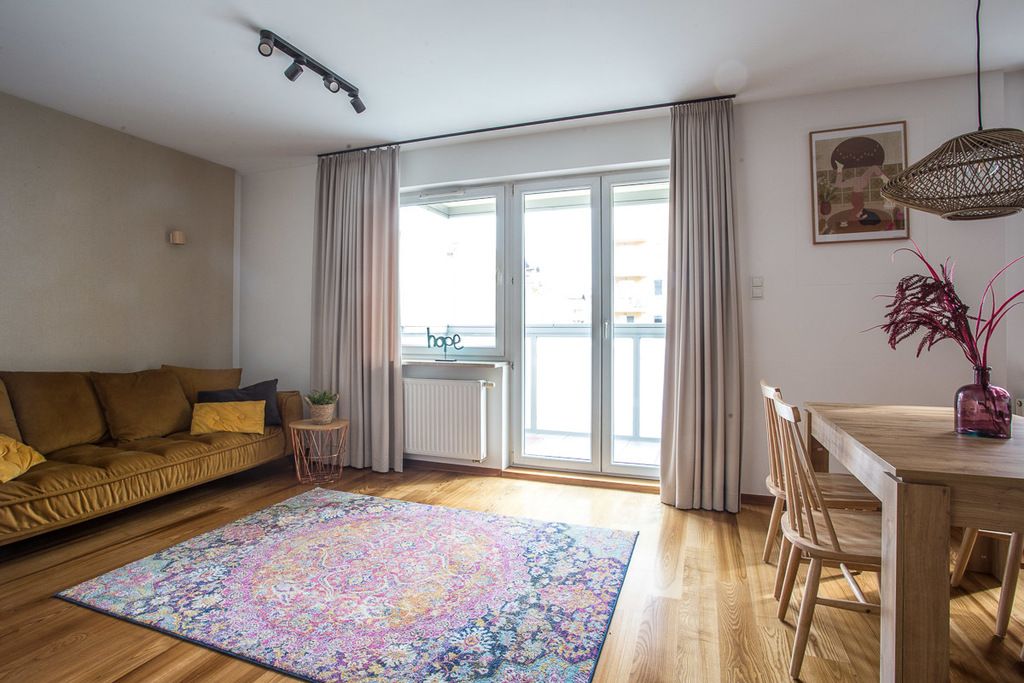 The living area is spacious and functional, featuring a sofa, coffee table, TV unit, and a dining table. From the living room there is access to a glazed balcony, which easily accommodates a table and chairs while still offering plenty of space.