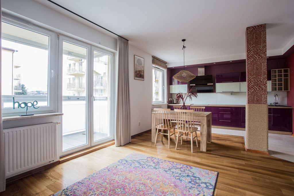 Strefa dzienna to duża i ustawna przestrzeń z sofą, stolikiem kawowym, szafką RTV oraz dodatkowo stołem jadalnianym. Mamy tutaj również wyjście na oszklony balkon gdzie swobodnie mieści się stolik i krzesła i nadal mamy dużo przestrzeni.