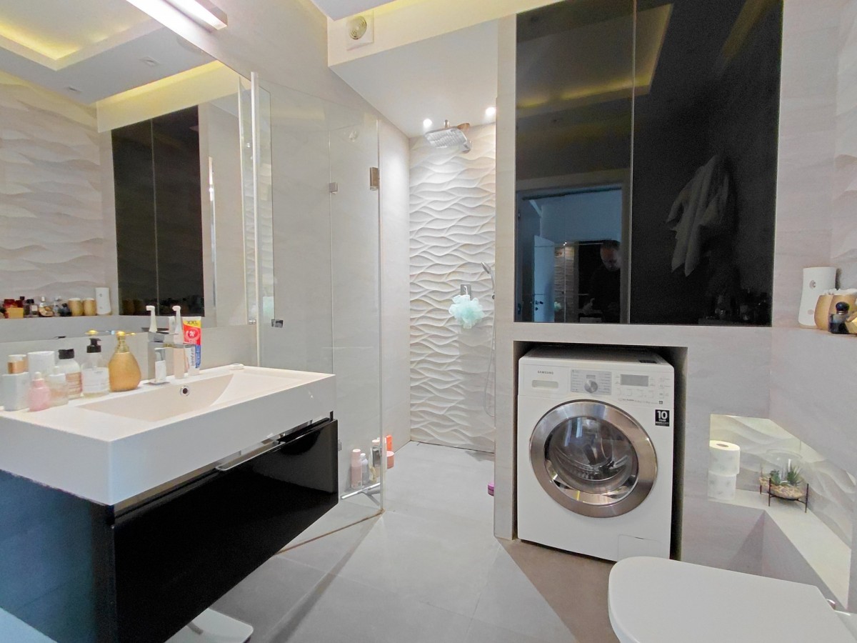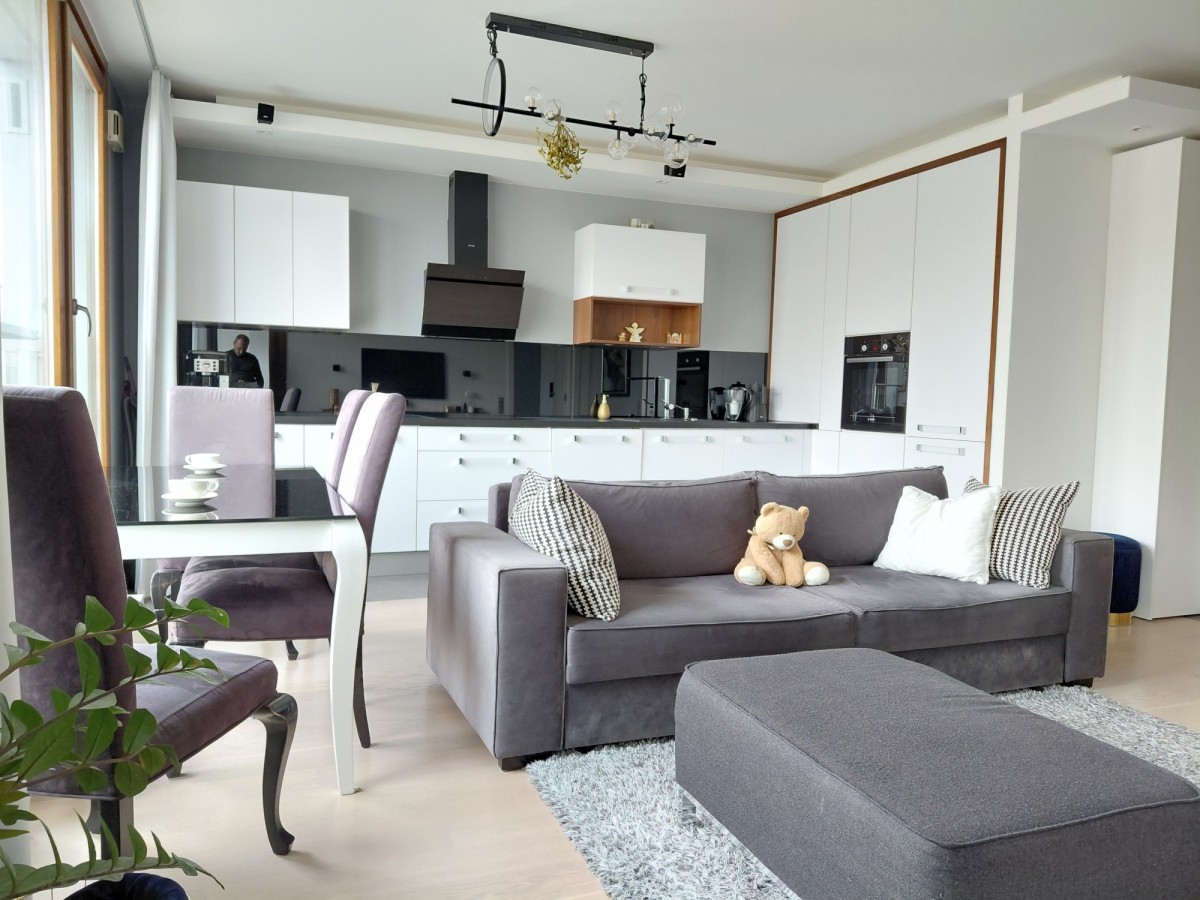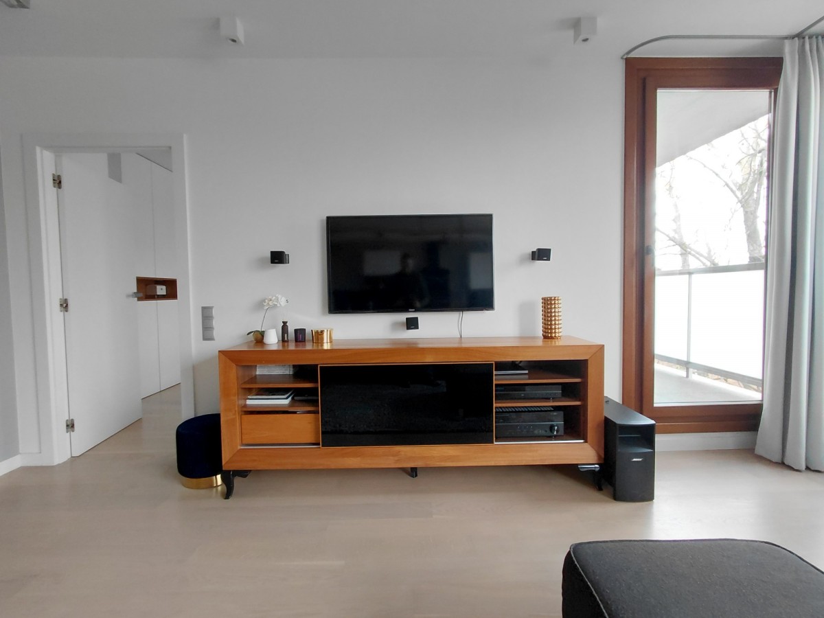 Apartament został wykończony i umeblowany przy użyciu materiałów wysokiej jakości. Lokal wyposażono również w wysokiej jakości sprzęt RTV.