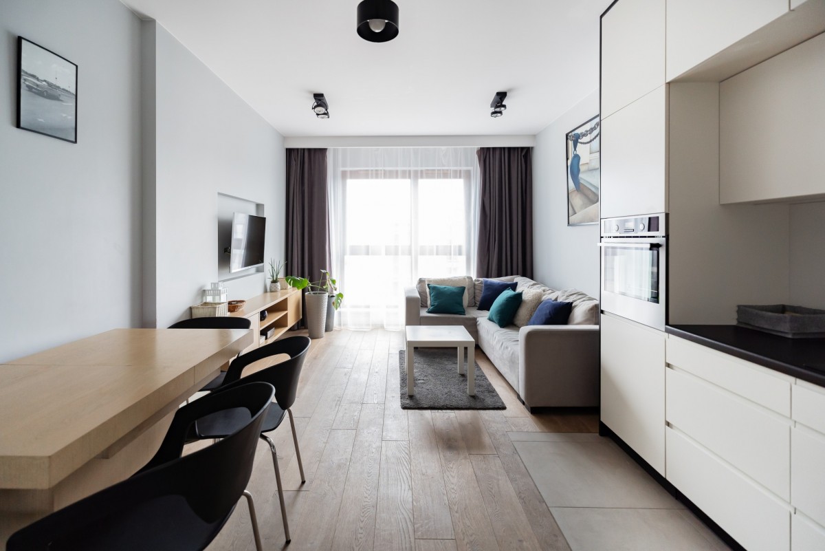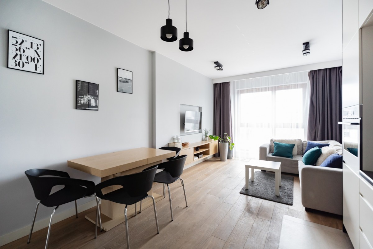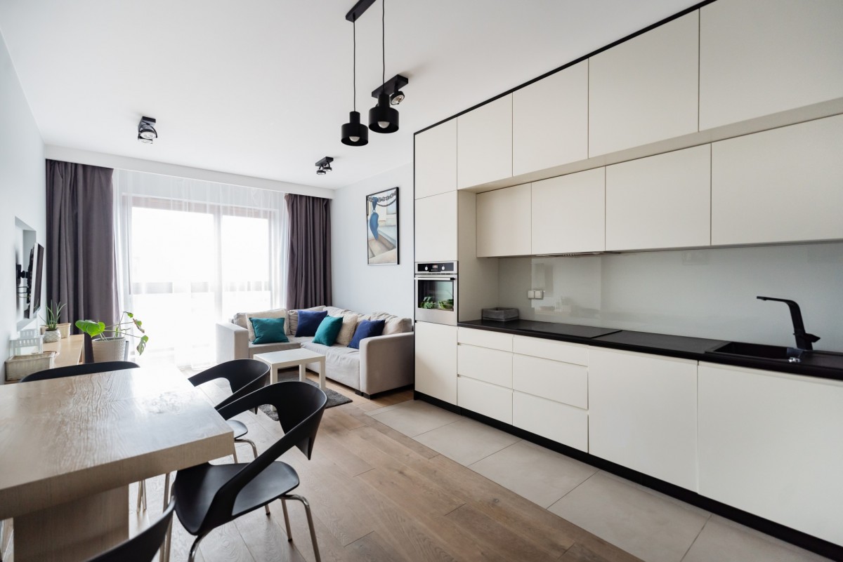 Mieszkanie jest przestronne, dobrze doświetlone i funkcjonalnie zaprojektowane. W salonie znajduje się aneks kuchenny z pełnym wyposażeniem AGD. Kuchnia została wykonana na zamówienie, z systemami Blum i magic corner, co zapewnia maksymalną ergonomię.