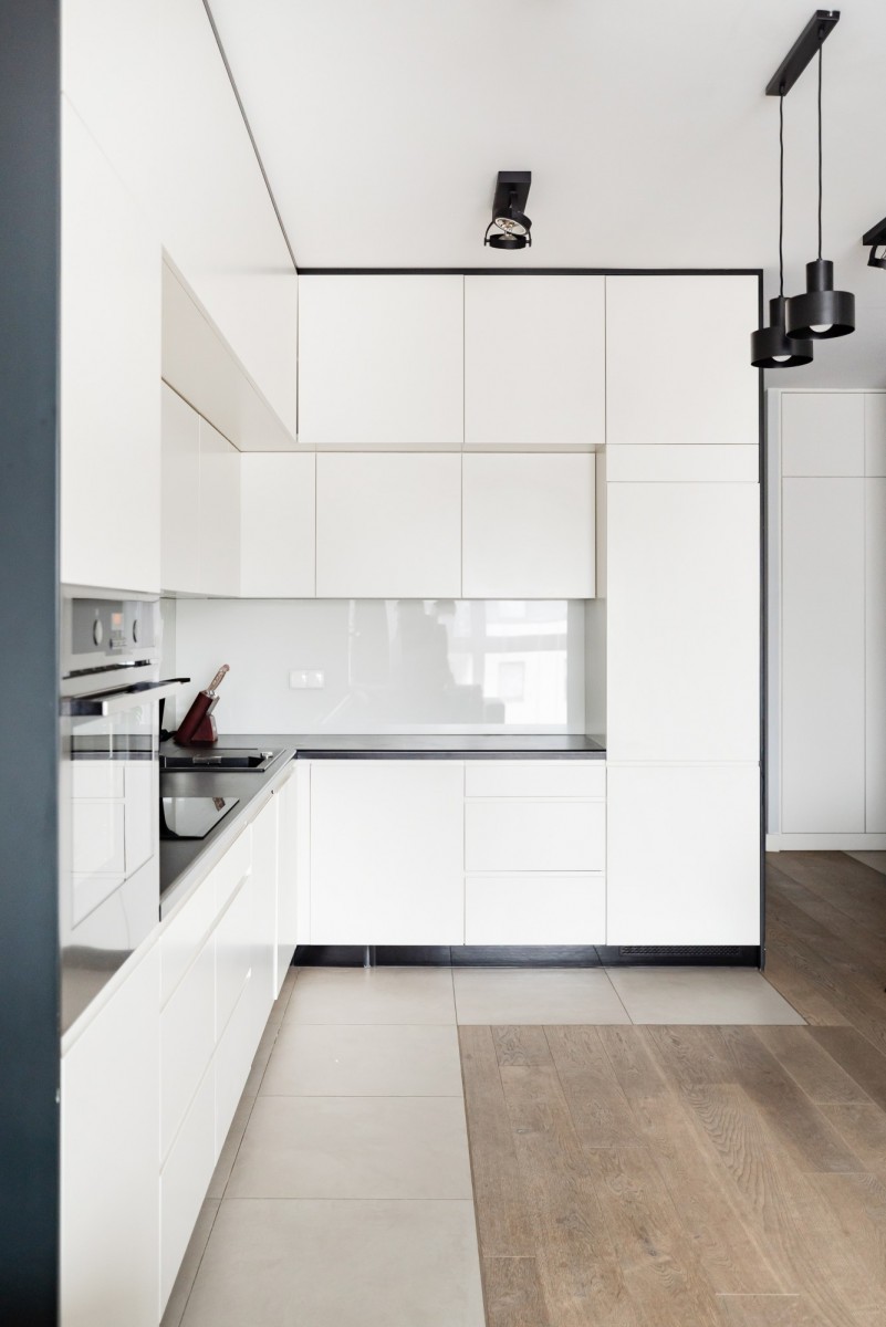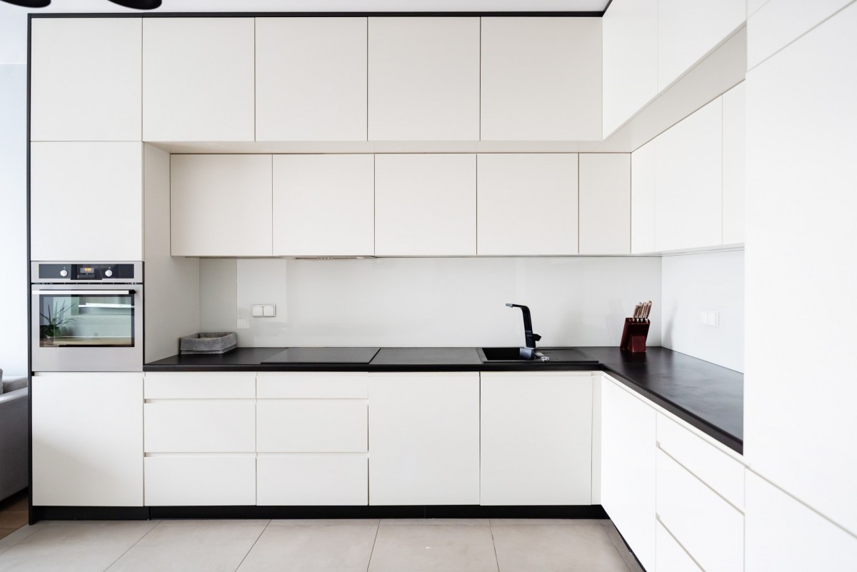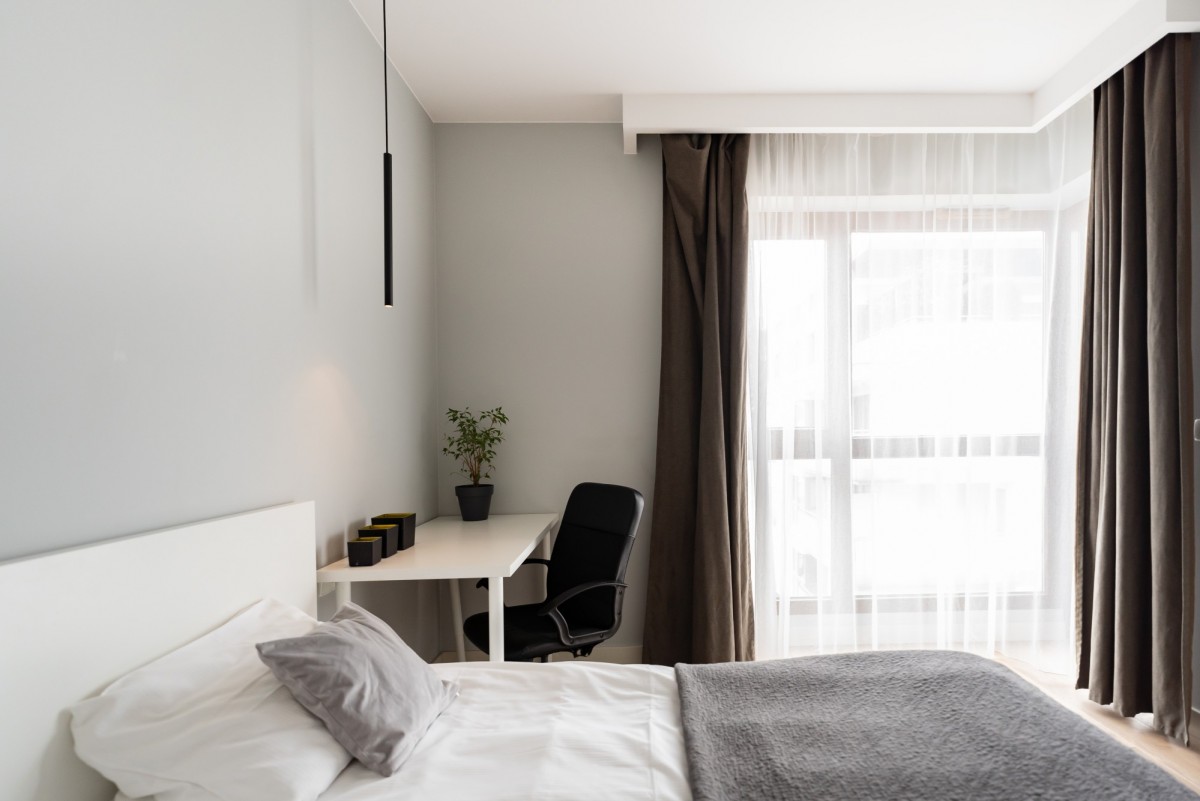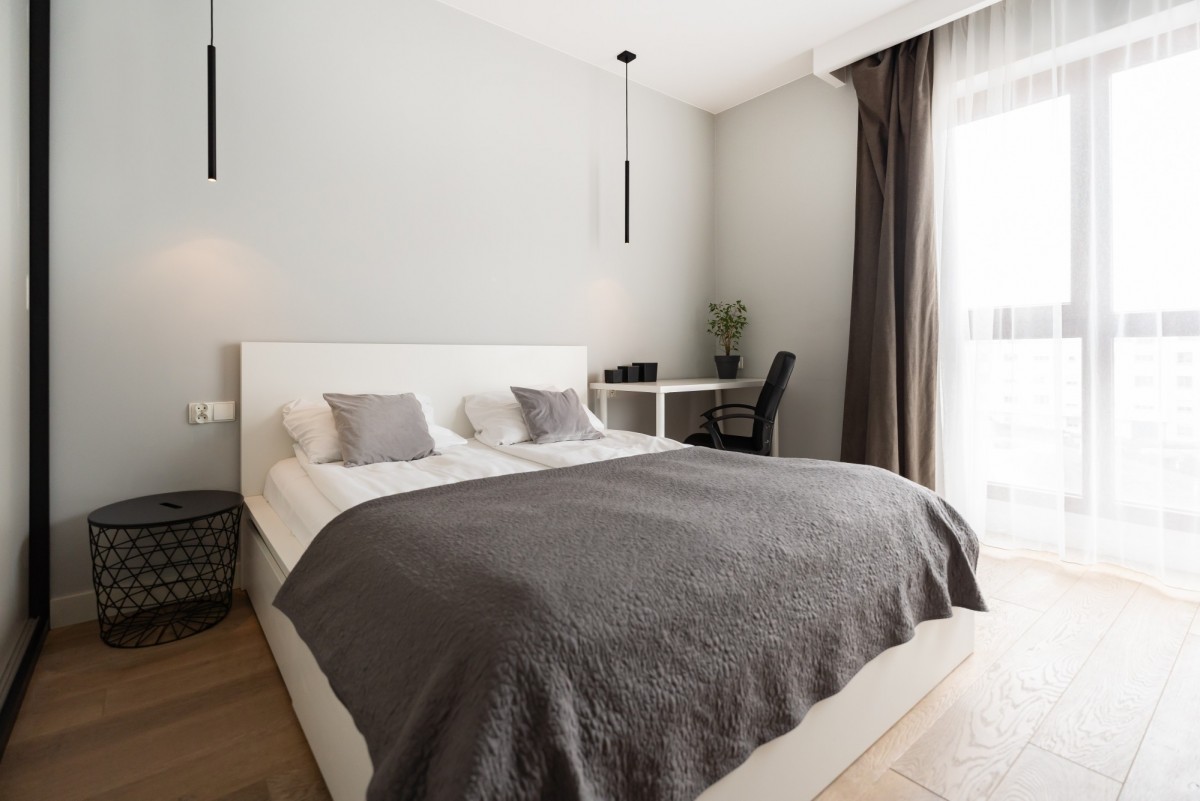 Mieszkanie jest przestronne, dobrze doświetlone i funkcjonalnie zaprojektowane. W salonie znajduje się aneks kuchenny z pełnym wyposażeniem AGD. Kuchnia została wykonana na zamówienie, z systemami Blum i magic corner, co zapewnia maksymalną ergonomię.