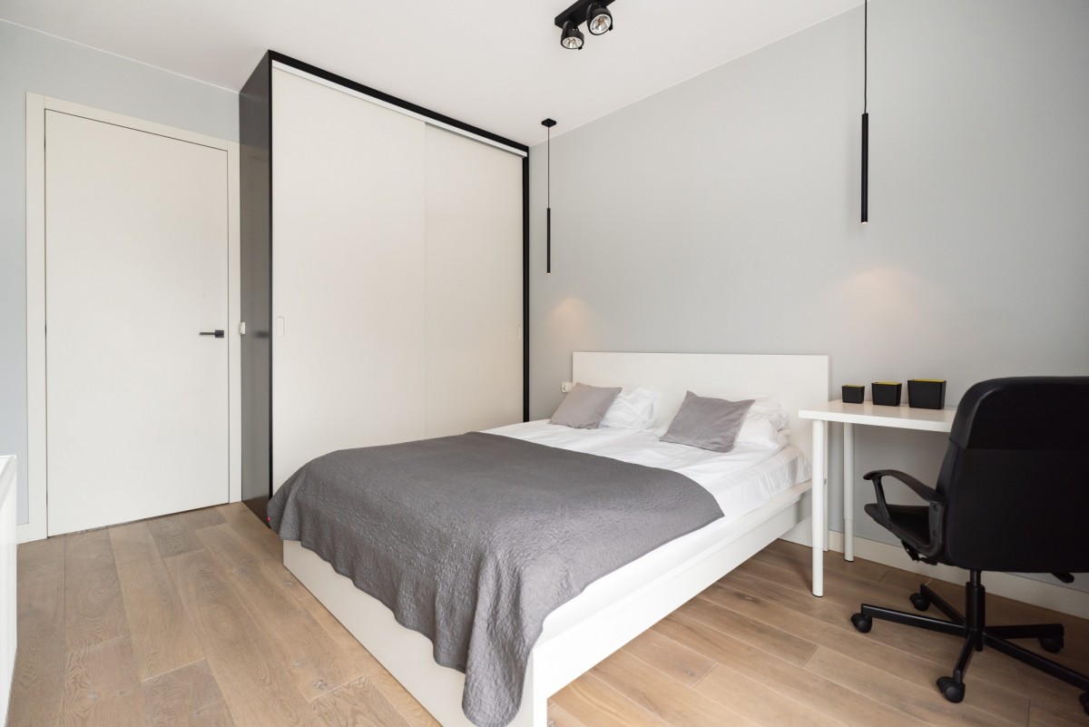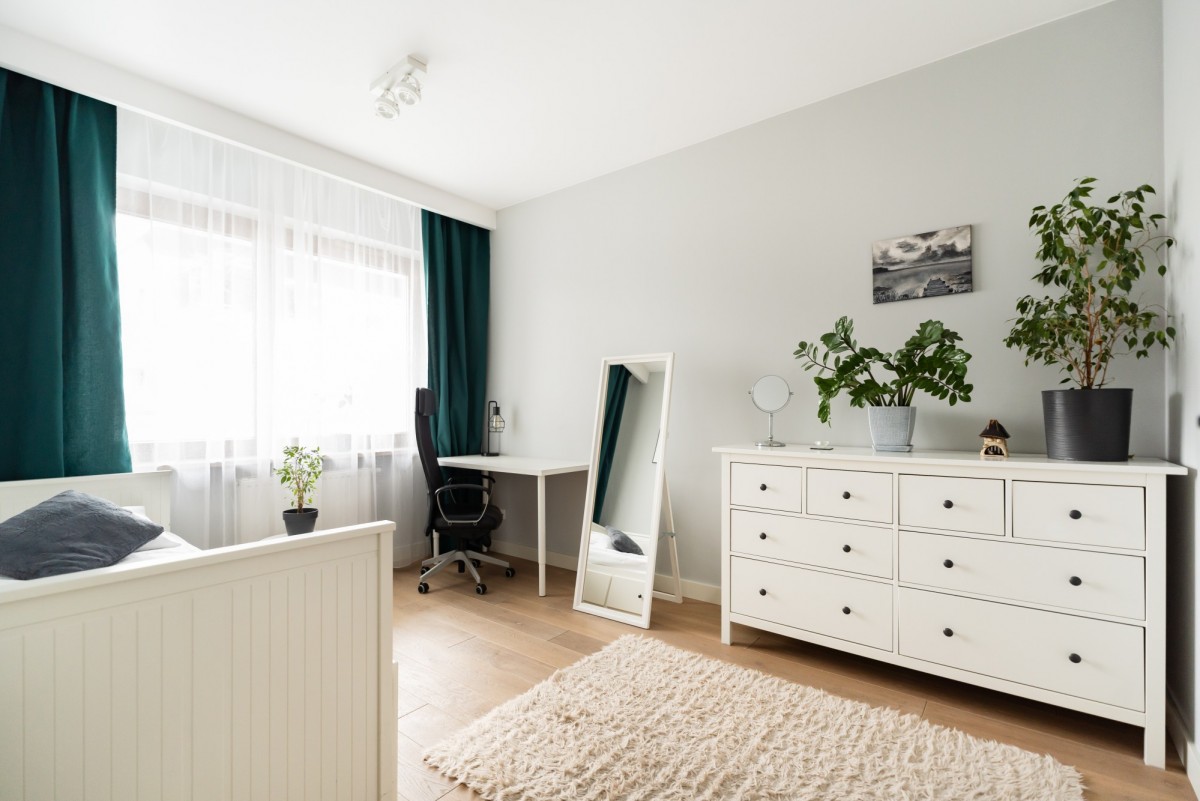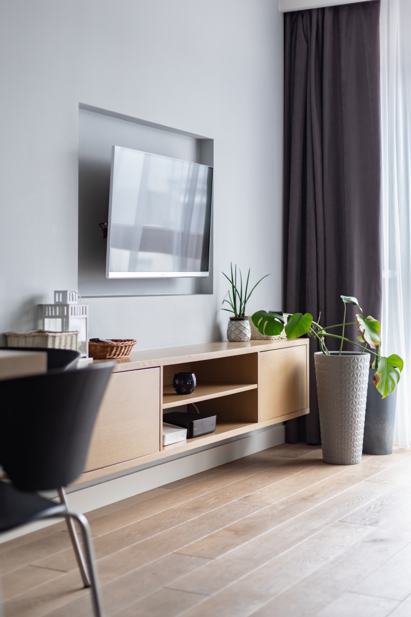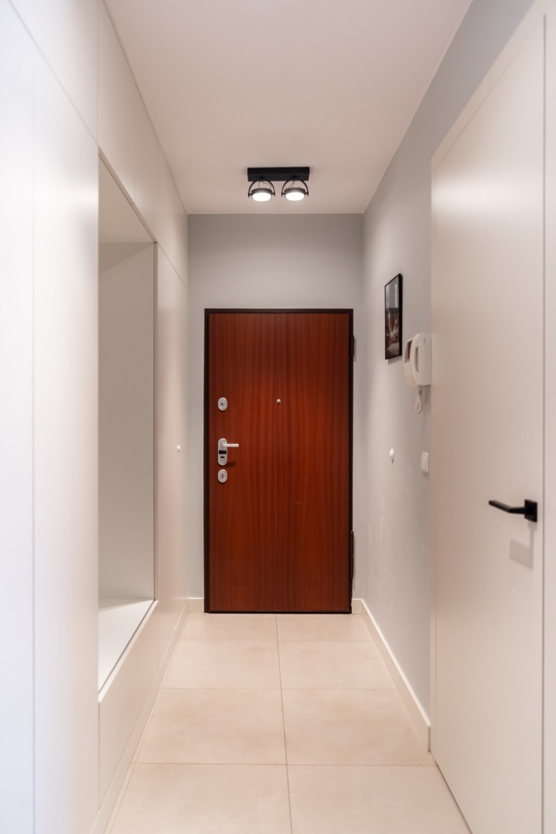 W sypialni głównej, łazience oraz przedpokoju wykonano zabudowy na wymiar, co zapewnia dużą ilość miejsca do przechowywania. W całym mieszkaniu położony jest drewniany parkiet, a w przedpokoju i łazience wysokiej jakości włoski gres. W łazience zastosowano ogrzewanie podłogowe.