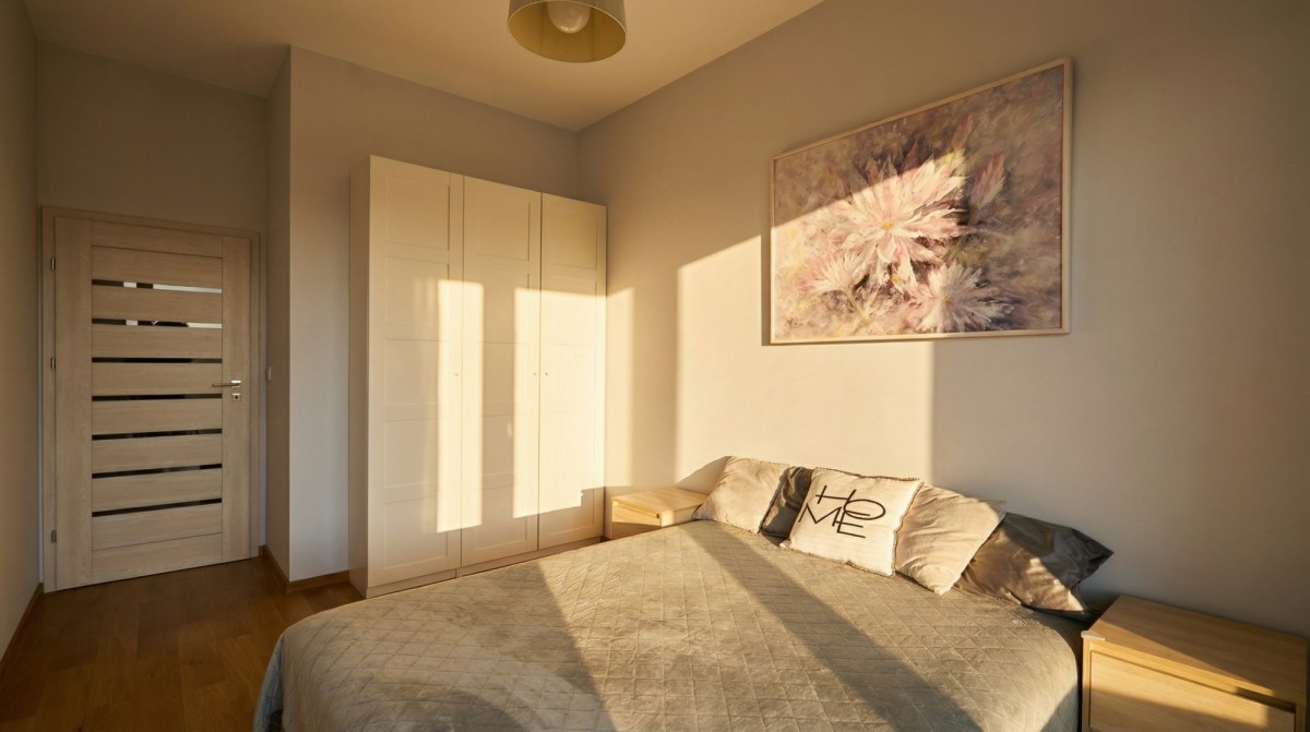 * sypialnia z szafą i łóżkiem małżeńskim,