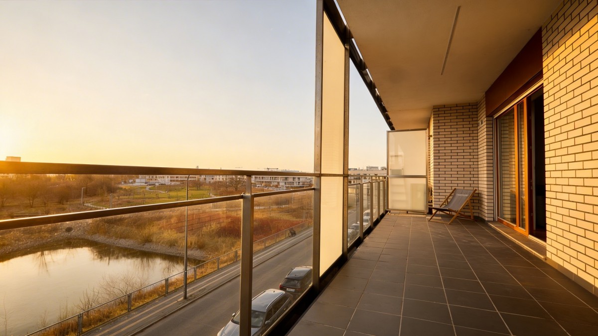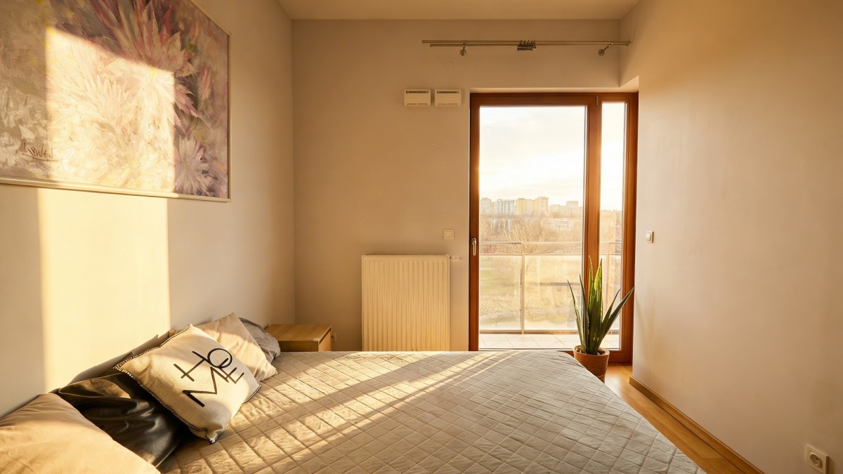 Jasny salon otwarty na kuchnię | Duży balkon z widokiem na centrum miasta z wyjściem z każdego pokoju | Sypialnia | Drugi pokój jako gabinet lub pokój dziecięcy | Pojemna garderoba w przedpokoju | Miejsce postojowe w garażu podziemnym | Nowe budownictwo