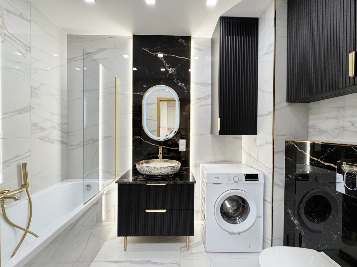 Łazienka wyposażona jest w wannę z funkcją prysznica, pralkę i szafki na wymiar.