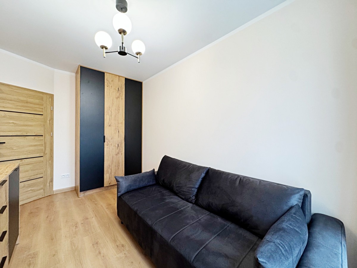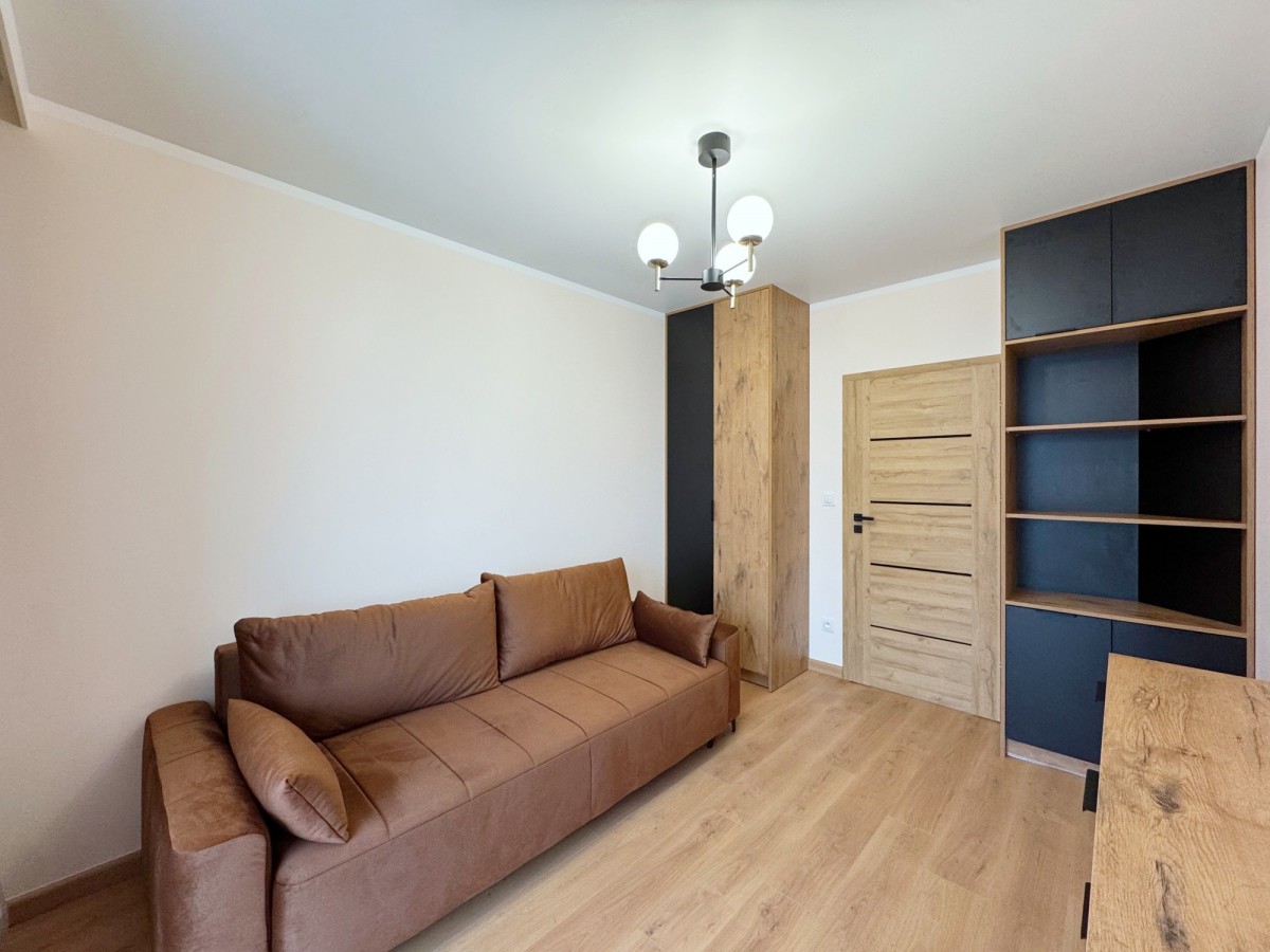Pokój 2 wyposażony jest w rozkładaną sofę , szafę zabudowaną, komodę, rolety dzień-noc, zasłony,