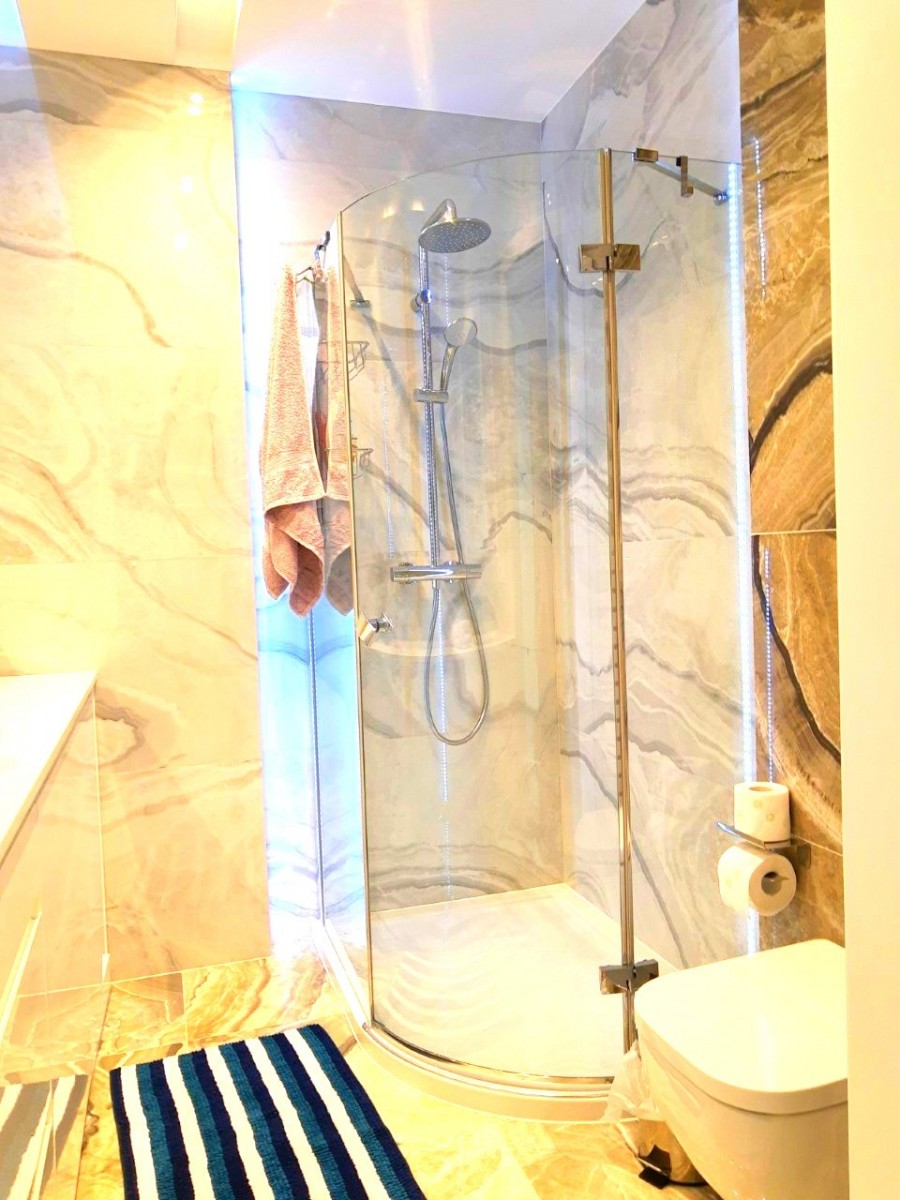 2 pokoje : 15m2, 12m2, kuchnia otwarta na salon 10m2, łazienka z prysznicem.