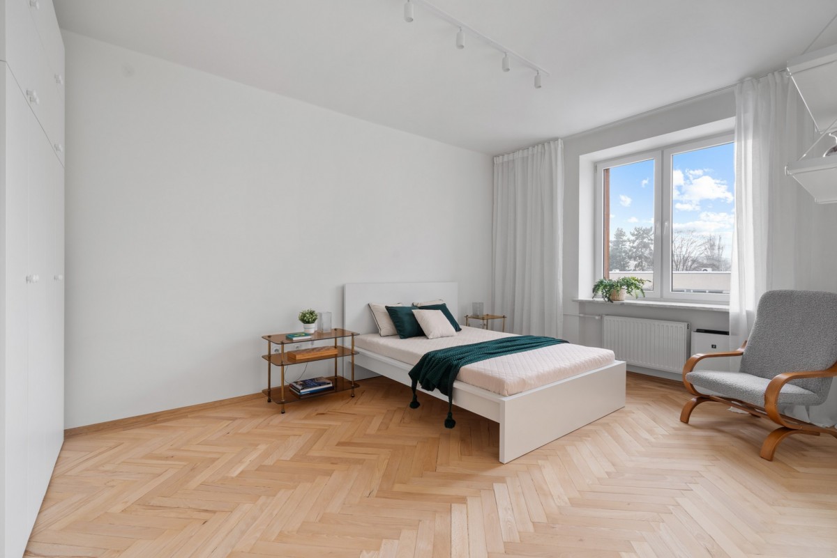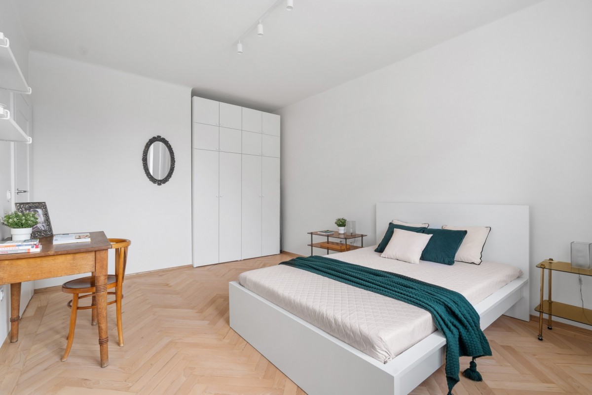 Oddzielny pokój - sypialnia, która gwarantuje intymność i spokój, z dużą szafą, biurkiem i wygodnym łóżkiem.