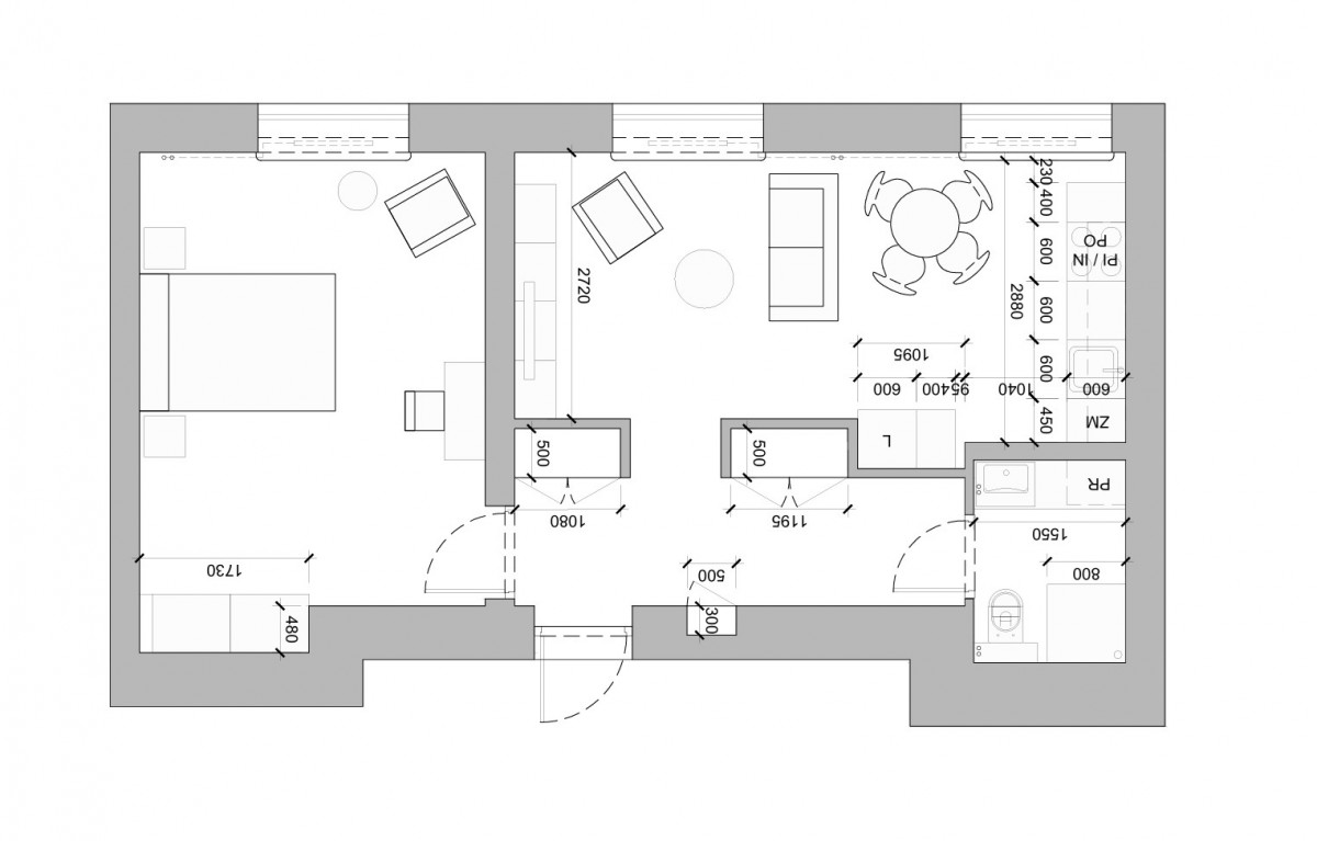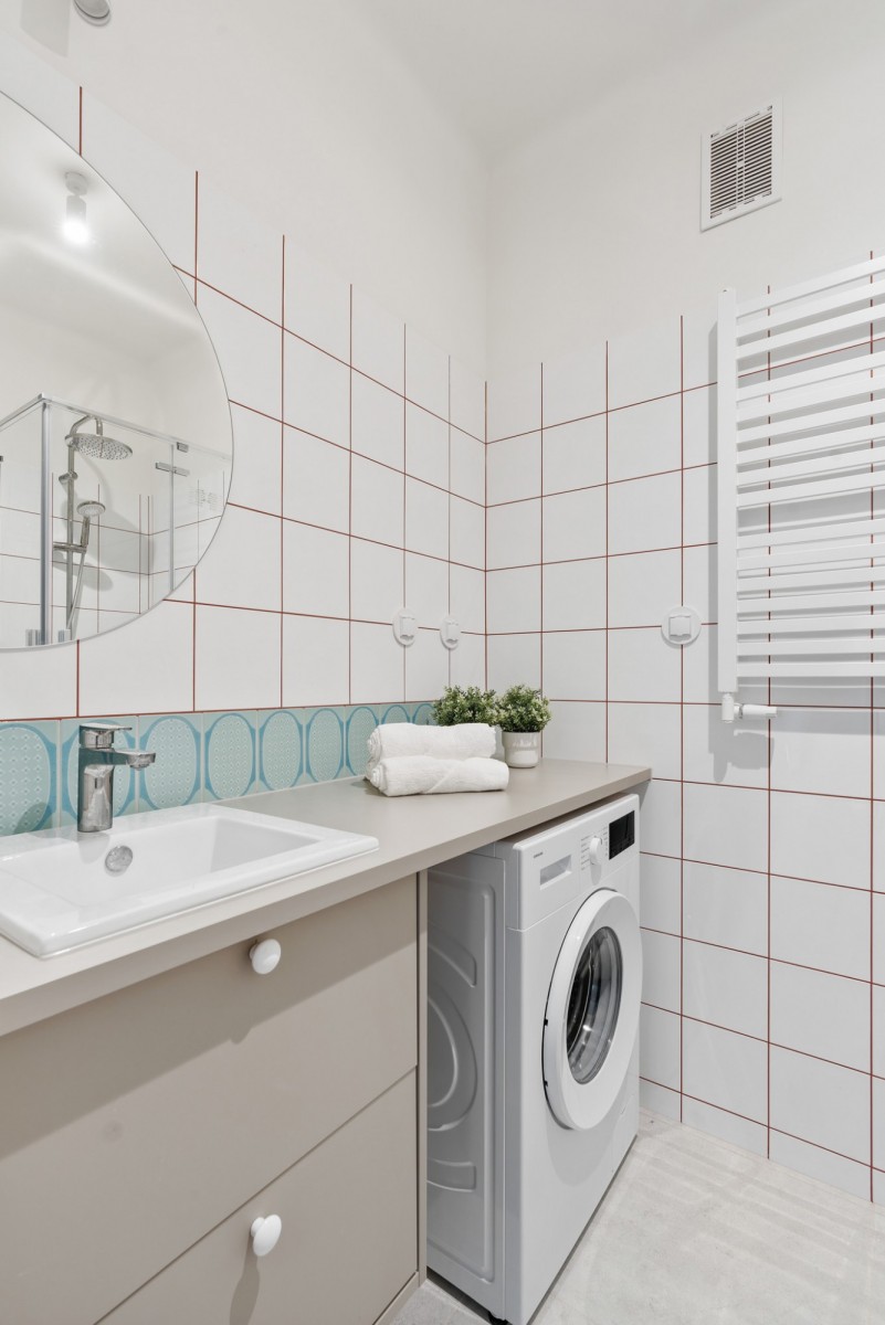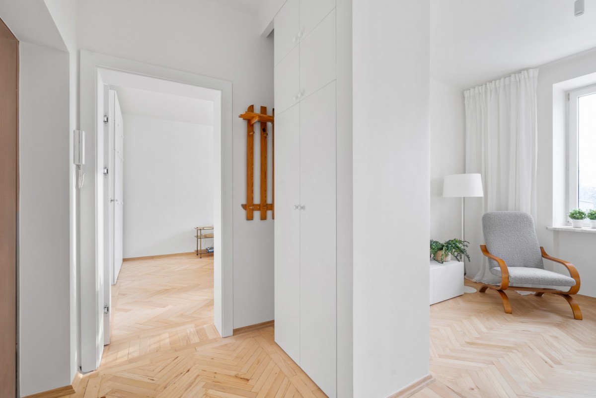 Przestrzeń została zaprojektowana w sposób przemyślany, dzieląc mieszkanie na strefę dzienną i prywatną: