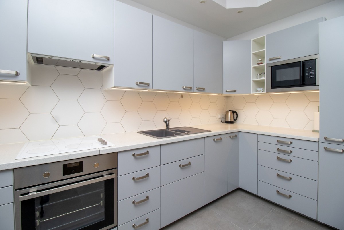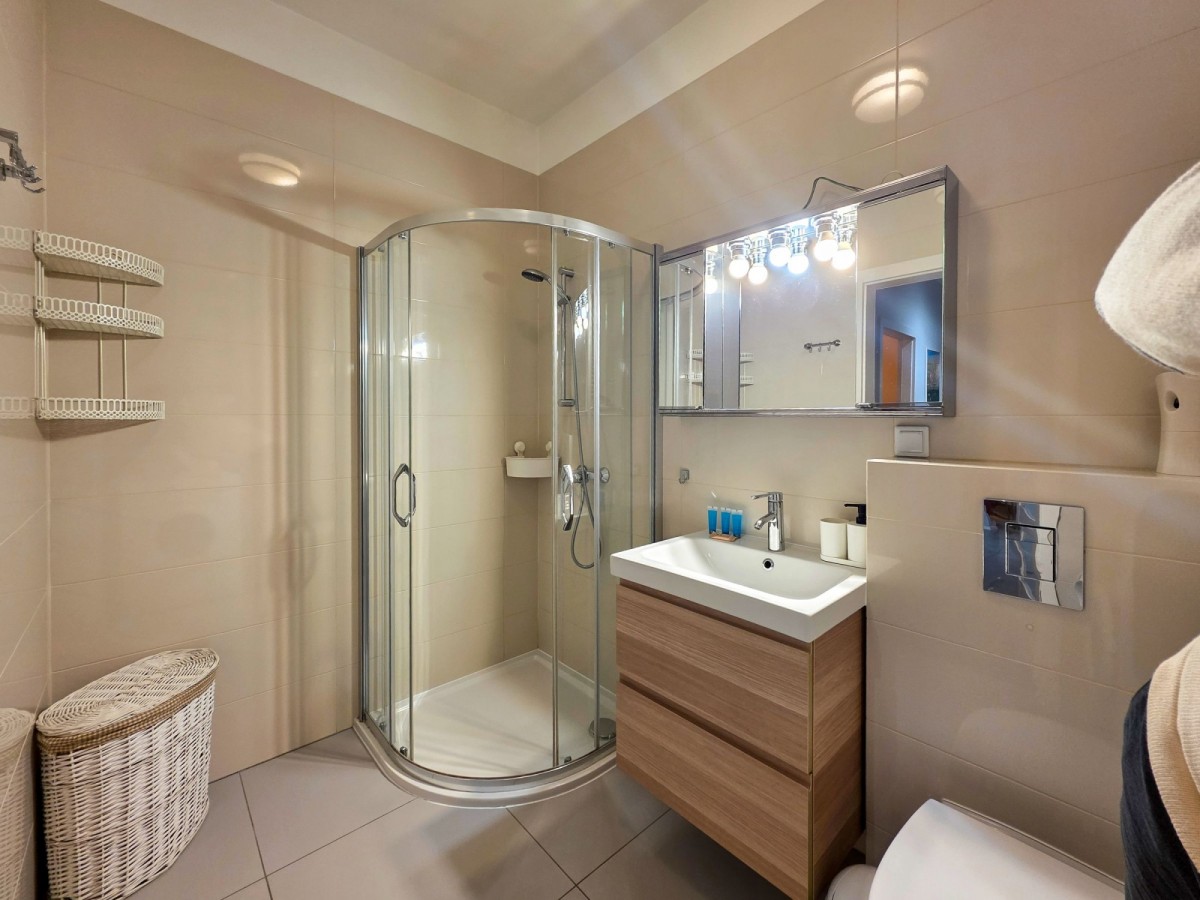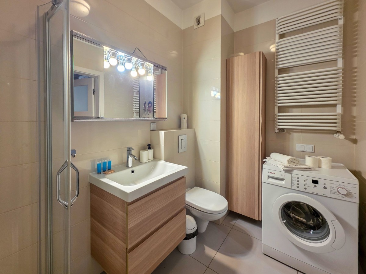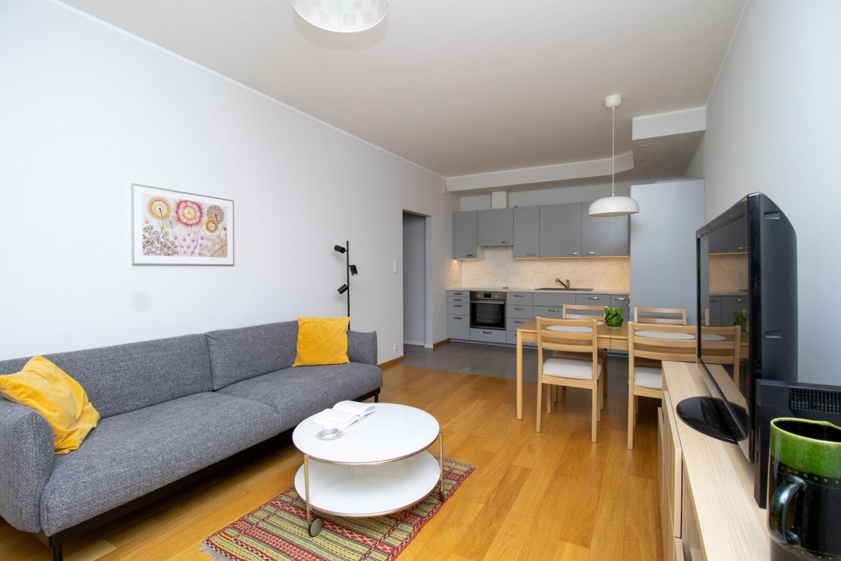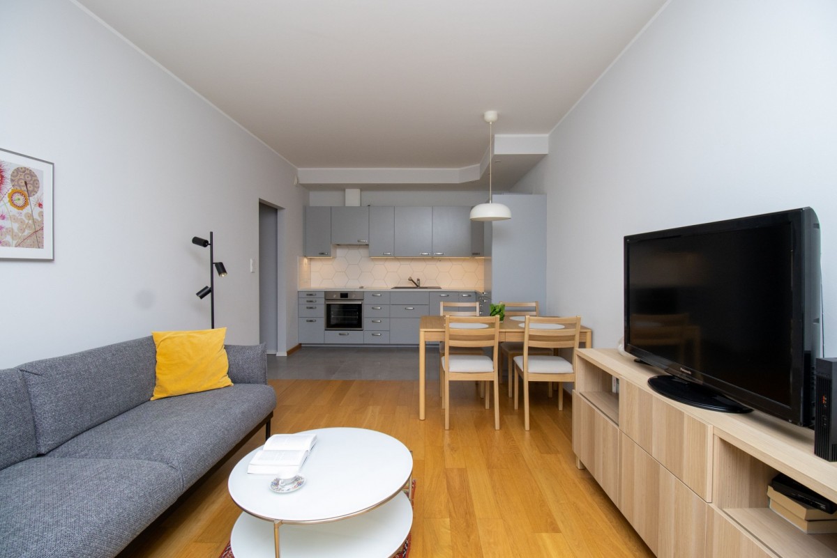 - Salon z aneksem kuchennym: sofa, szafka RTV z telewizorem, rozkładany stół z 4 krzesłami, meble kuchenne w zabudowie, pełne AGD (lodówka, zmywarka, piekarnik, płyta, mikrofalówka),