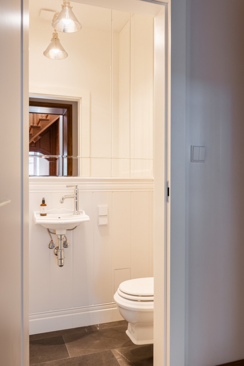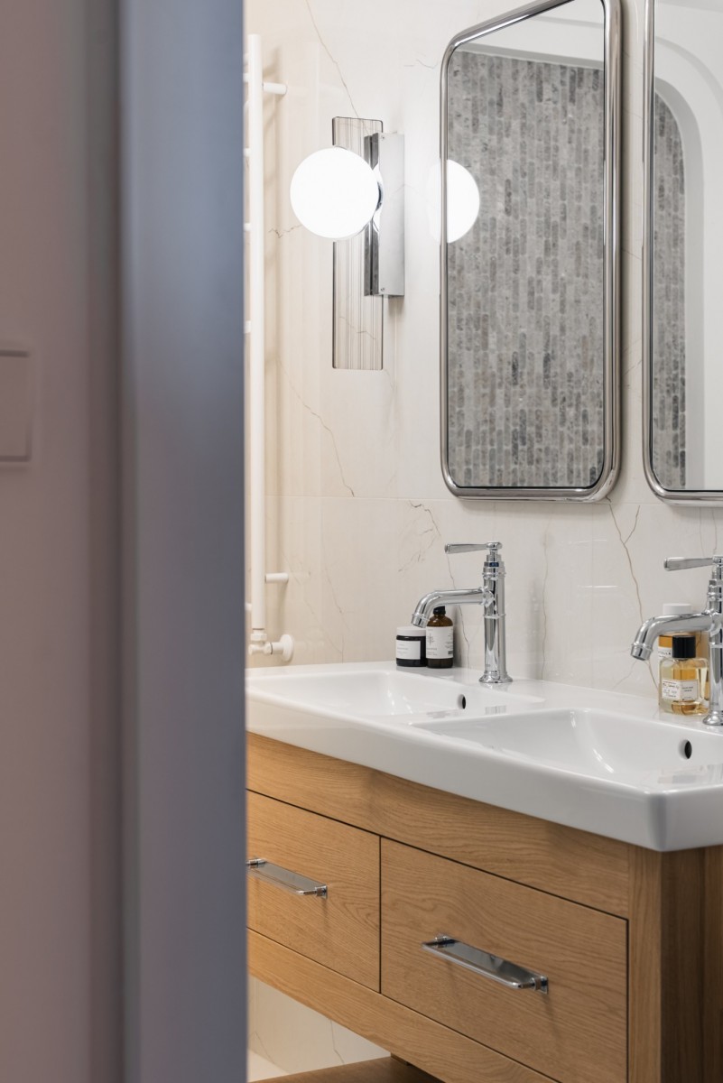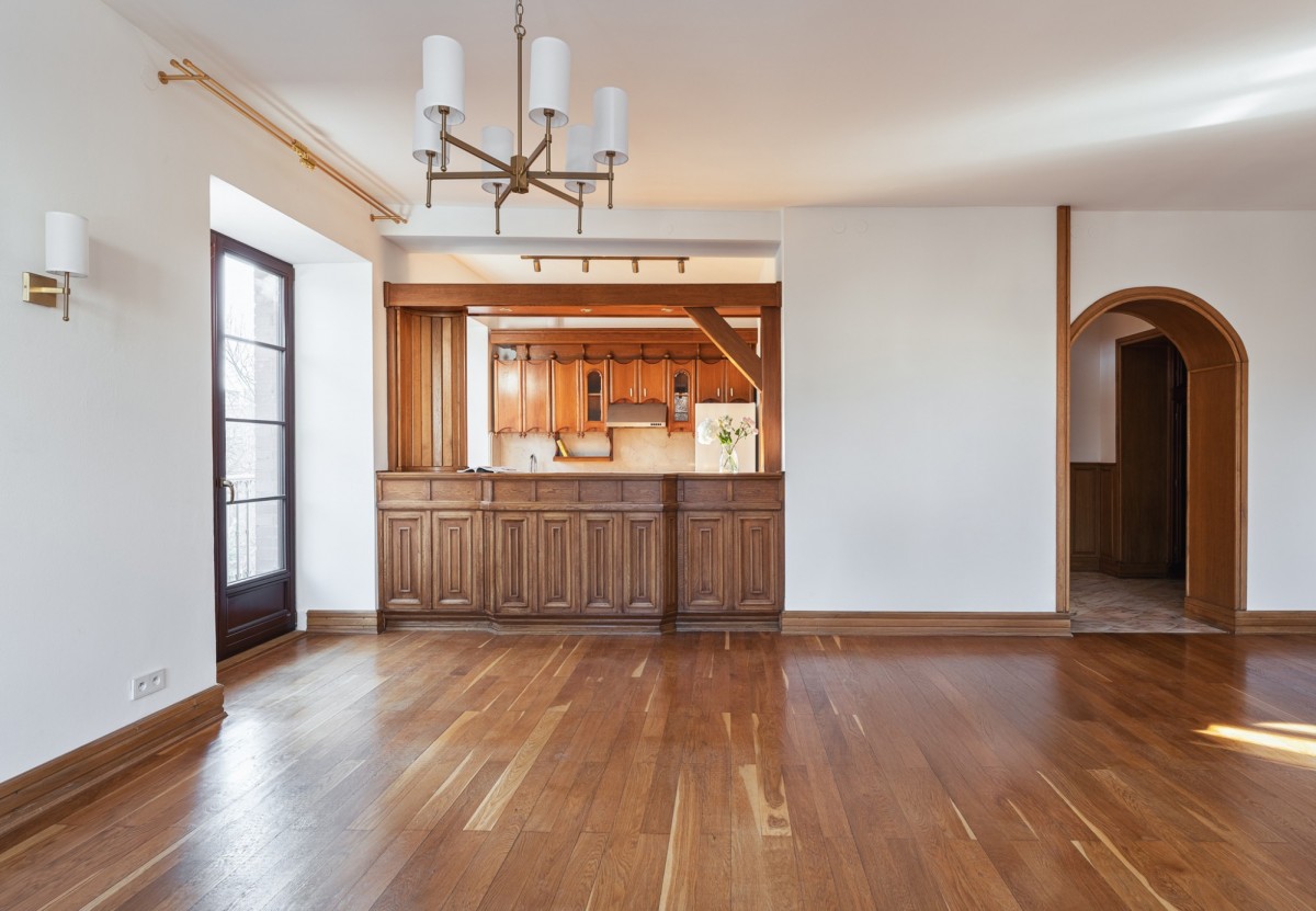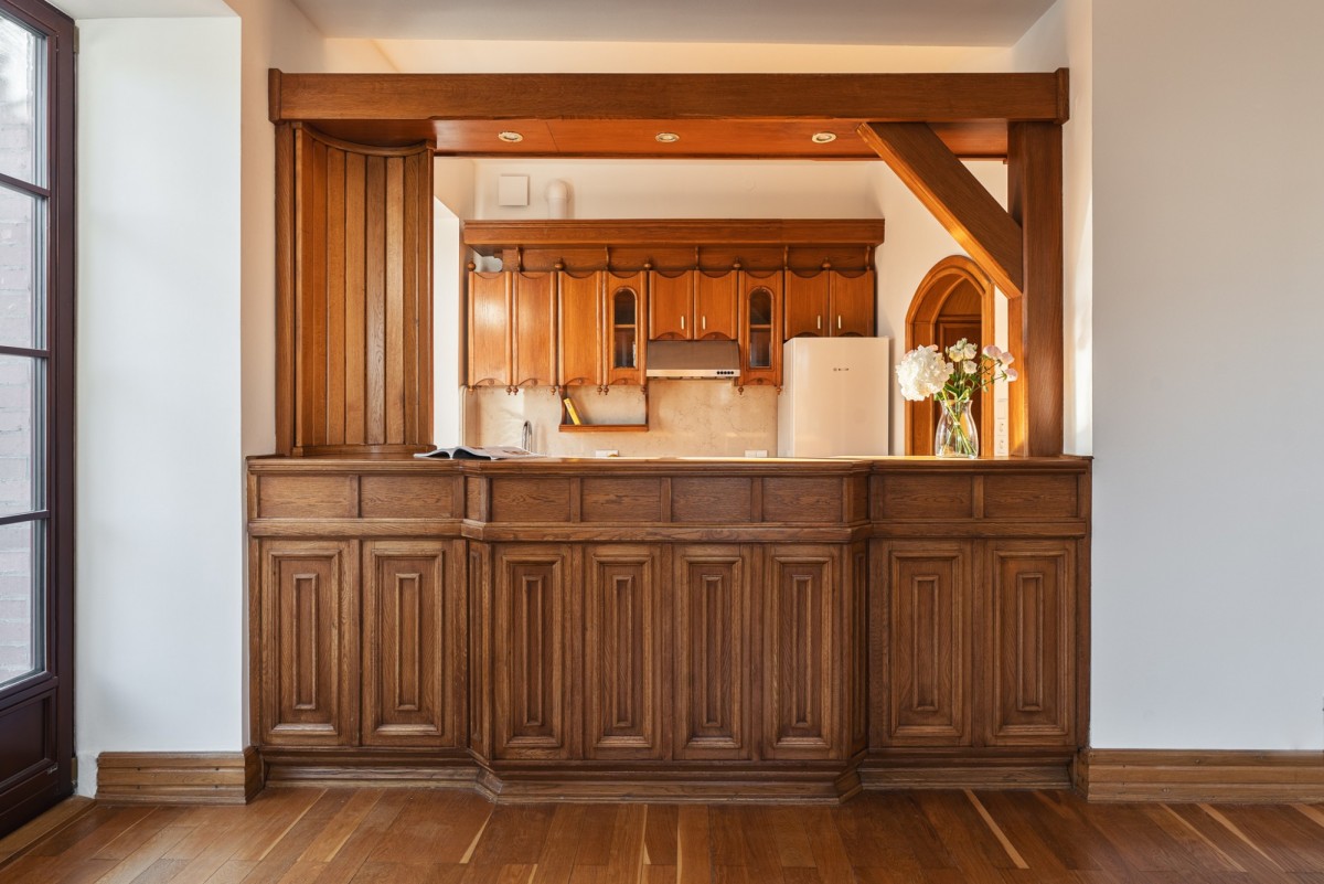Apartament przeszedł kompleksowy remont, podczas którego zachowano i wyeksponowano oryginalne, wysokiej jakości elementy, takie jak dębowa podłoga i naturalny marmur, łącząc je z wysokiej klasy armaturą oraz sprzętem AGD renomowanych marek. Wnętrze zachowało swój przedwojenny charakter, oferując jednocześnie wysoki standard techniczny i komfort współczesnego użytkowania.