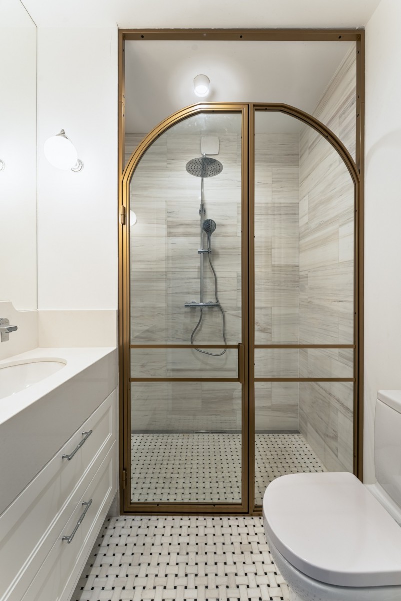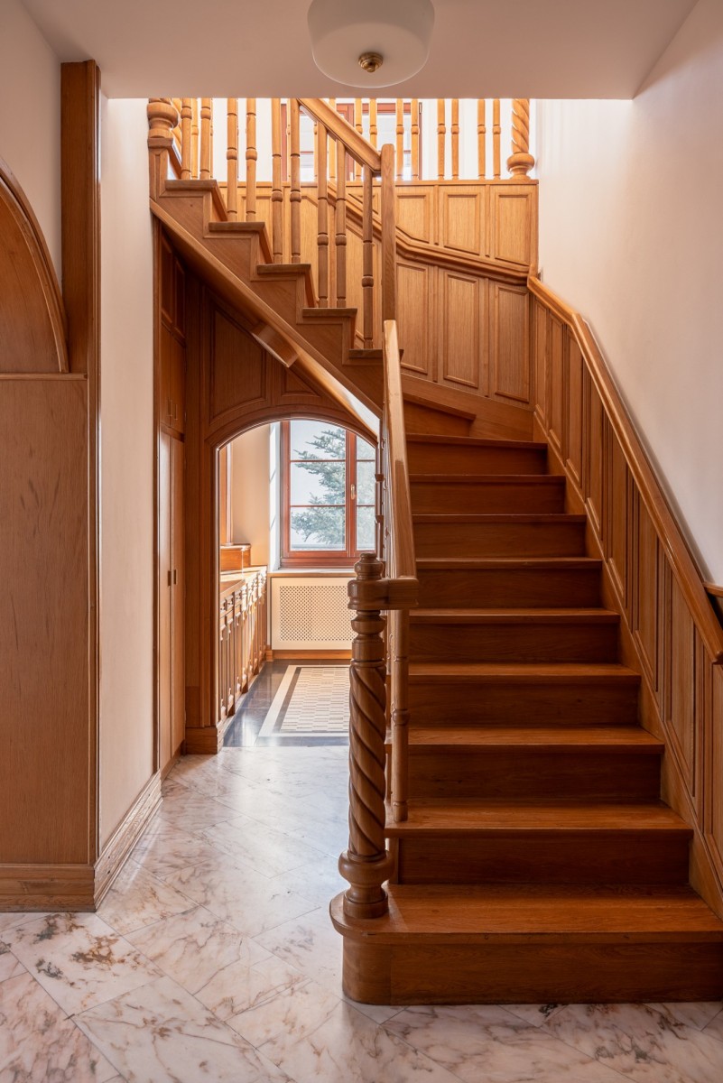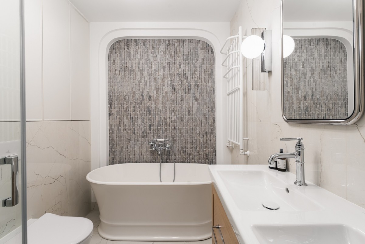 The apartment has undergone a comprehensive renovation, during which original high-quality features, such as oak wooden flooring and natural marble, were carefully preserved and combined with high-end sanitary fittings and branded household appliances, maintaining the pre-war character while offering modern comfort.
