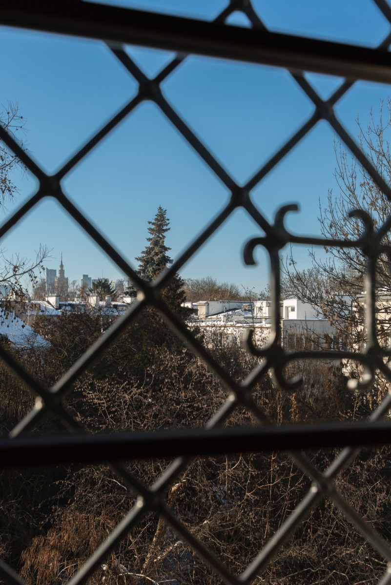 The living area includes a spacious living room with a fireplace and direct access to a large terrace. Large windows ensure excellent natural light and views of mature trees surrounding the villa, enhancing privacy and tranquility. From the upper level, there are views of central Warsaw, including the Palace of Culture and Science.