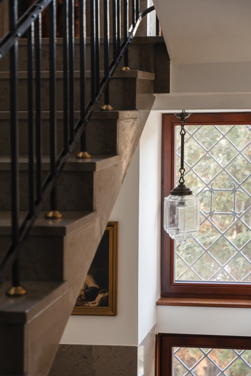 Strefę dzienną stanowi przestronny salon z kominkiem i wyjściem na duży taras. Duże okna zapewniają doskonałe doświetlenie wnętrz oraz widok na starodrzew otaczający willę, a z górnego poziomu apartamentu rozciąga się widok na centrum Warszawy, w tym na Pałac Kultury i Nauki.