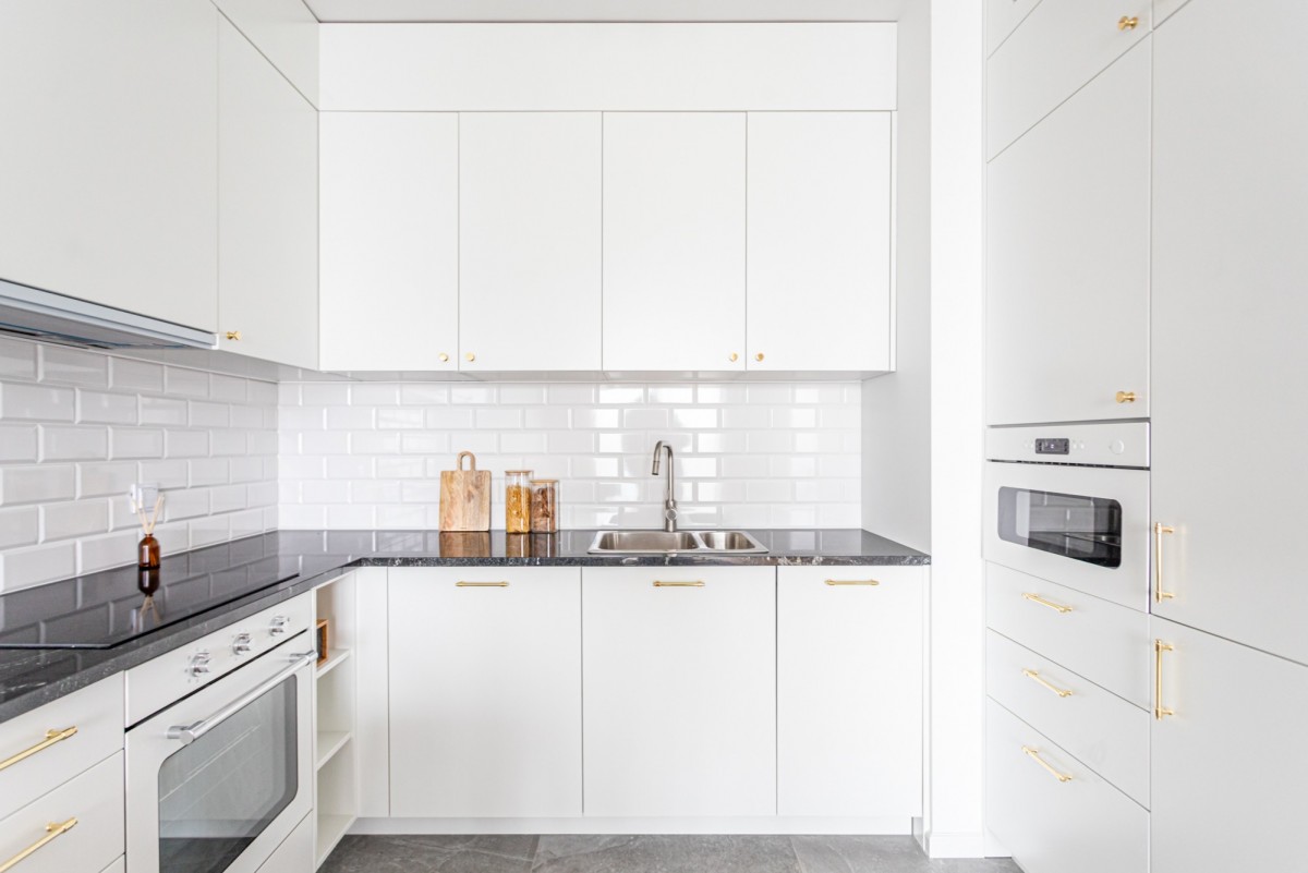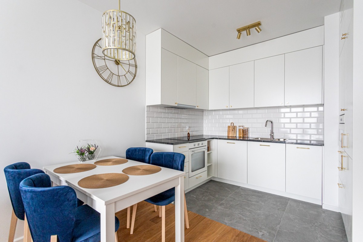 - Nowoczesna kuchnia z białą zabudową została w pełni wyposażona w wysokiej klasy sprzęt AGD i płytę indukcyjną.