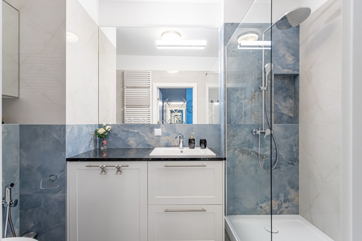 - Nowoczesna, jasna łazienka wyposażona jest w prysznic z deszczownicą oraz pralkę.