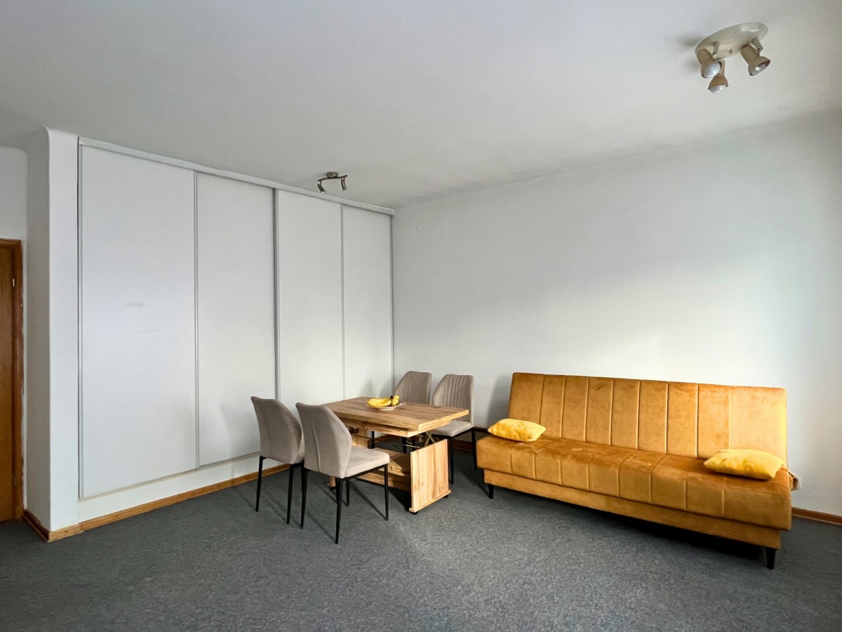 - Pokój 1 - 25 m² - rozkładana kanapa, duża szafa, stolik kawowy, fotel, stół jadalniany dla 4 osób