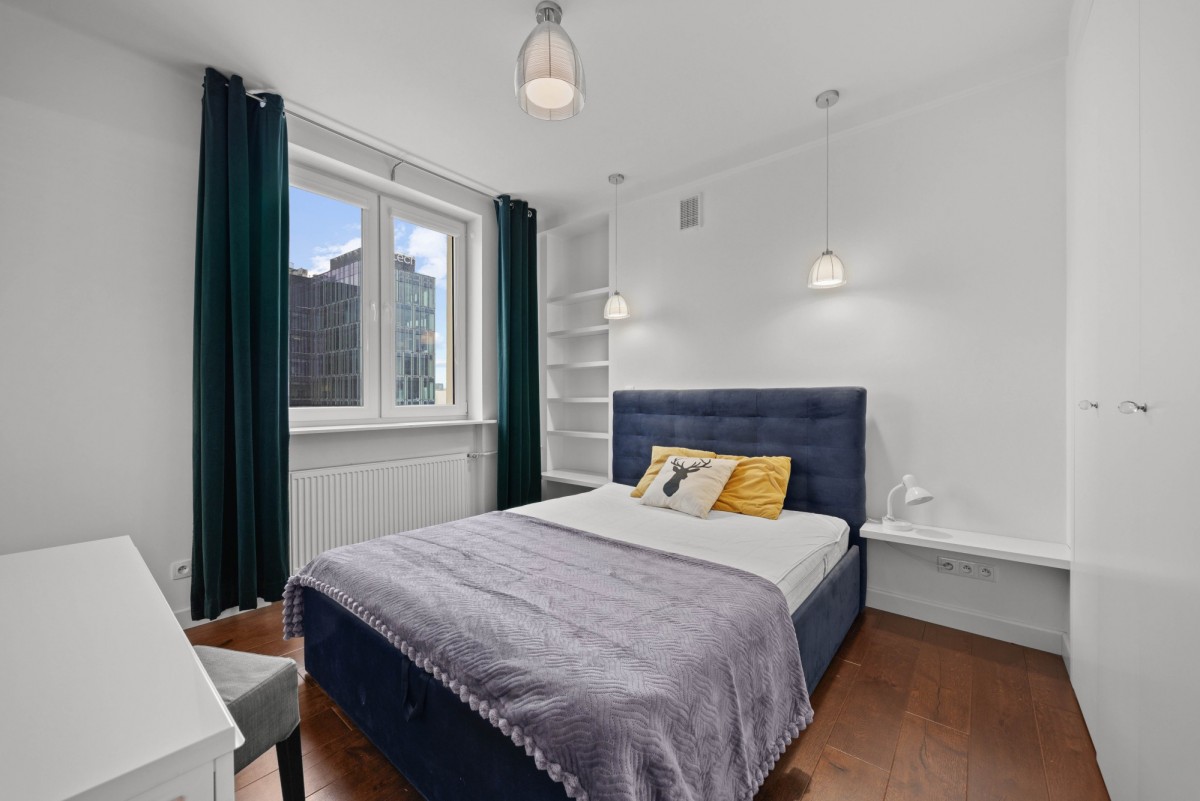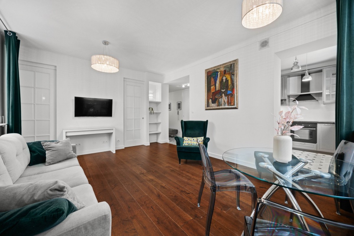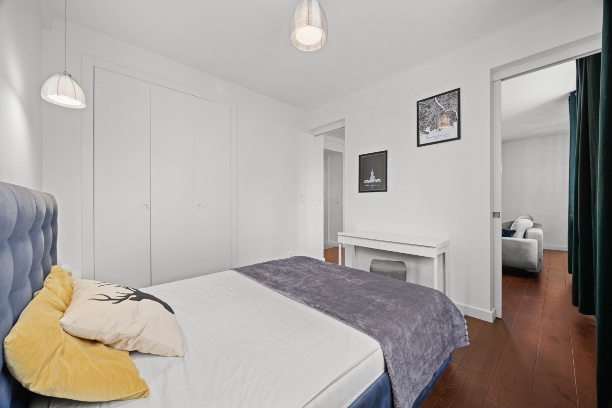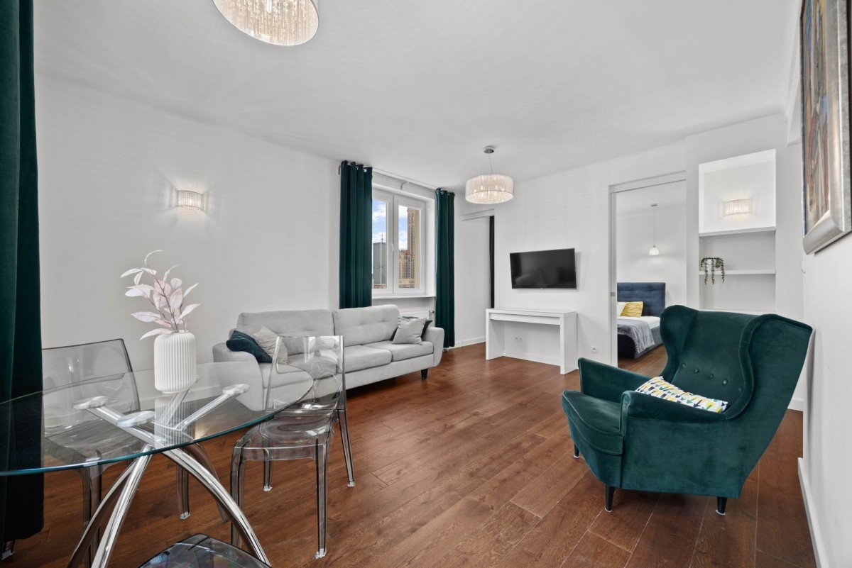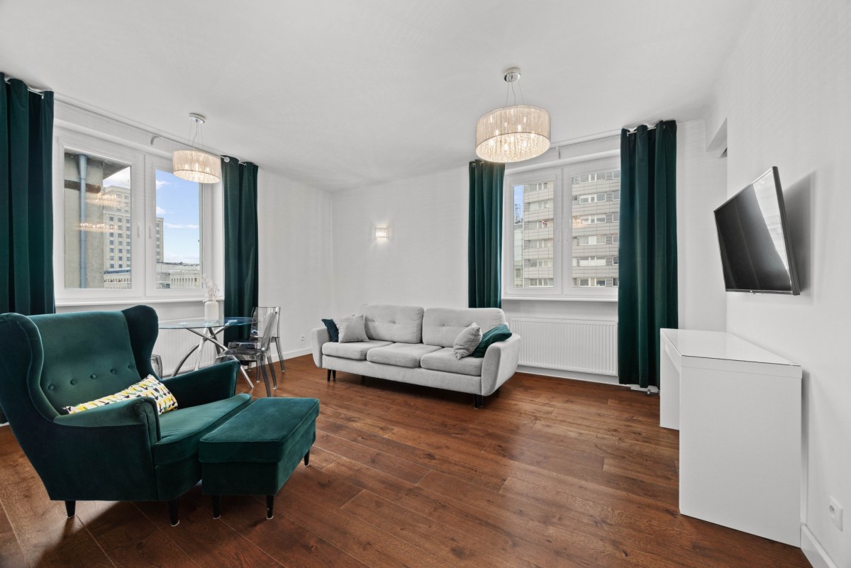 Powierzchnia mieszkania wynosi 50,50 m2 i znajduje się na VI piętrze w kamienicy. Składa się z pokoju dziennego, oddzielnej kuchni, sypialni, łazienki i przedpokoju. Kuchnia jest wyposażona w meble oraz w sprzęt AGD tj. lodówkę, piekarnik, płytę indukcyjną, okap, zmywarkę. W salonie znajduje się wygodna sofa, stolik kawowy, telewizor oraz wygodny fotel. Z salonu bezpośrednio niezwykły widok na PKiN. W sypialni jest łóżko o szerokości 160 cm oraz duża szafa w zabudowie. W łazience jest nowy natrysk, szafki. Dodatkowy schodek na pralkę i pranie. W przedpokoju znajdują się dwie bardzo duża szafy, która może pełnić funkcję garderoby.