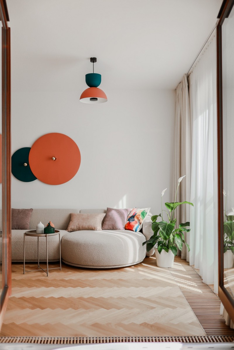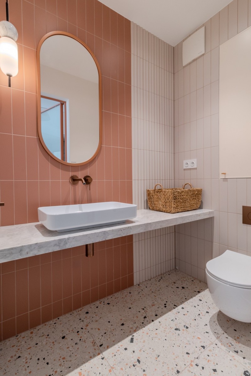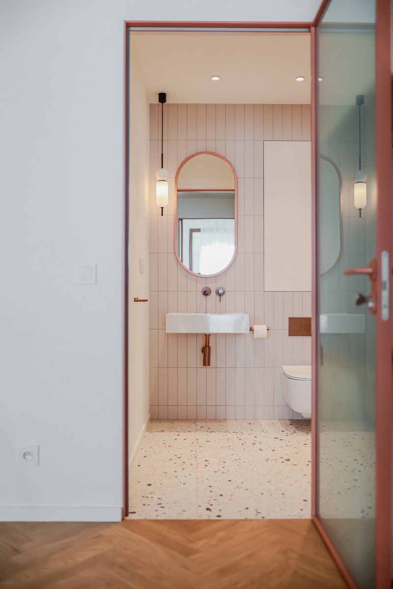 At ground level, between the building and the Polish Theatre, there’s Arnold Szyfman Passage paved with Roman-style stones. From the first floor up begins the residential section with stairway access to a green rooftop terrace, decked with exotic wood.