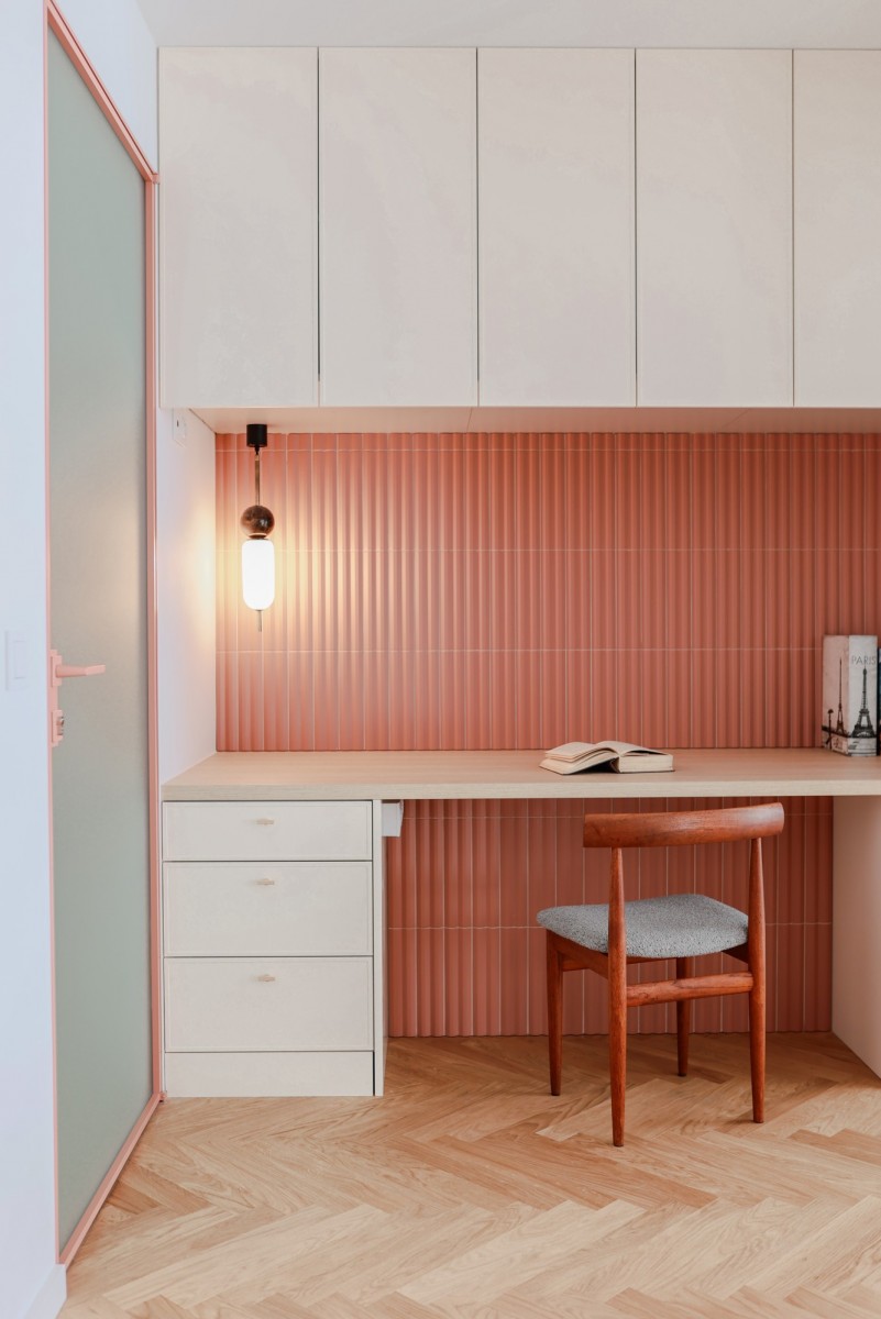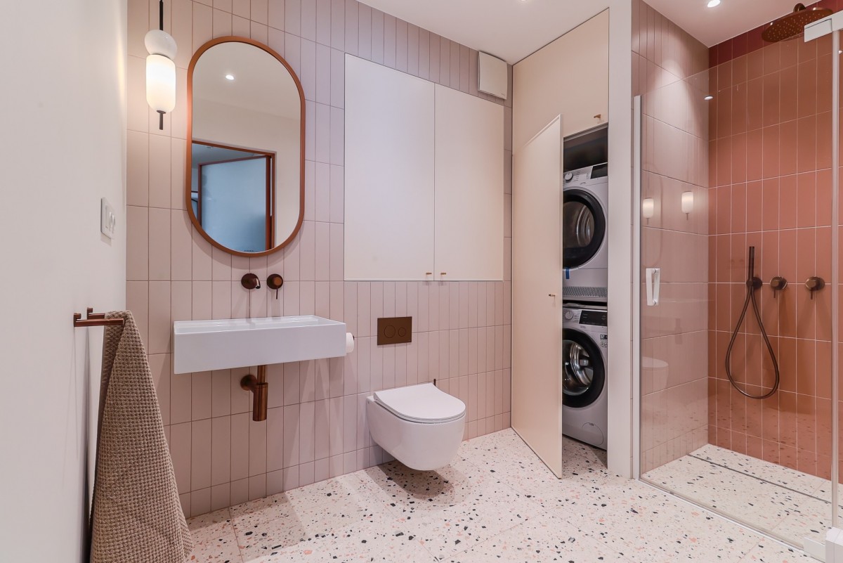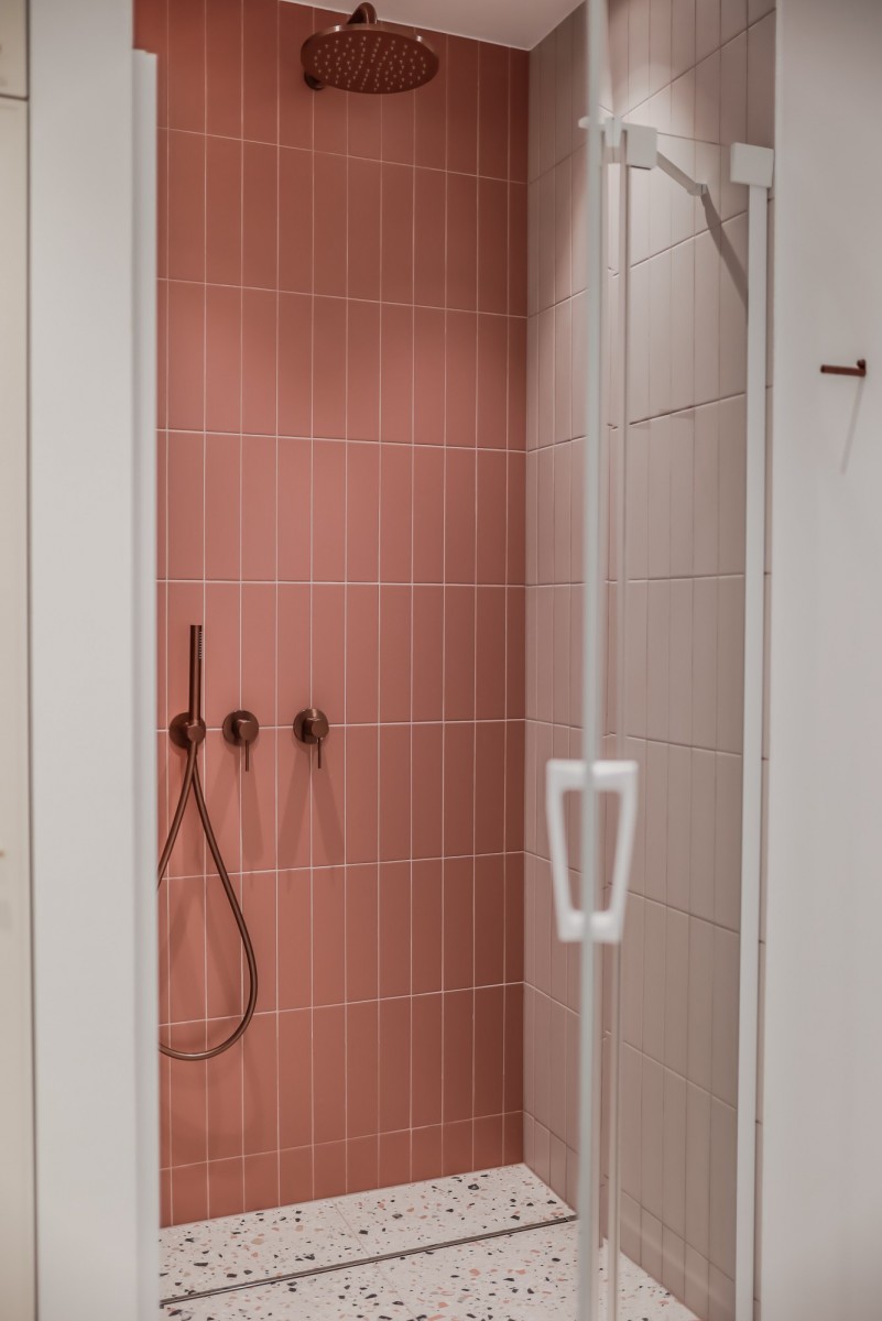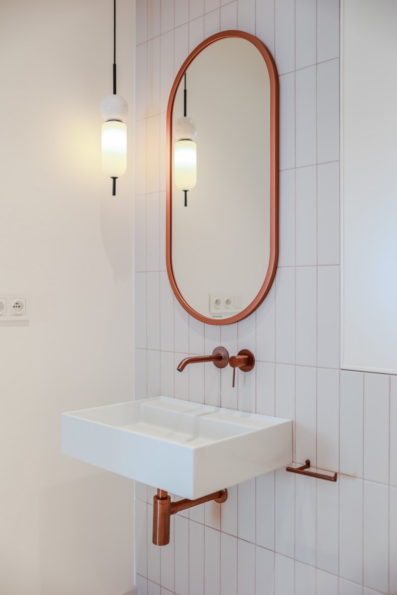 At ground level, between the building and the Polish Theatre, there’s Arnold Szyfman Passage paved with Roman-style stones. From the first floor up begins the residential section with stairway access to a green rooftop terrace, decked with exotic wood.