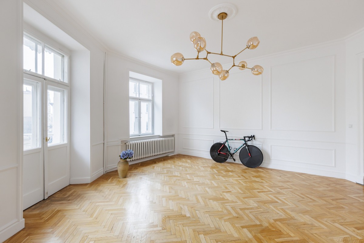 Przestronny apartament o powierzchni ok. 97 m² zachwyca wysokością pomieszczeń (3,4 m), dużą ilością naturalnego światła oraz klasycznymi detalami charakterystycznymi dla warszawskich kamienic.