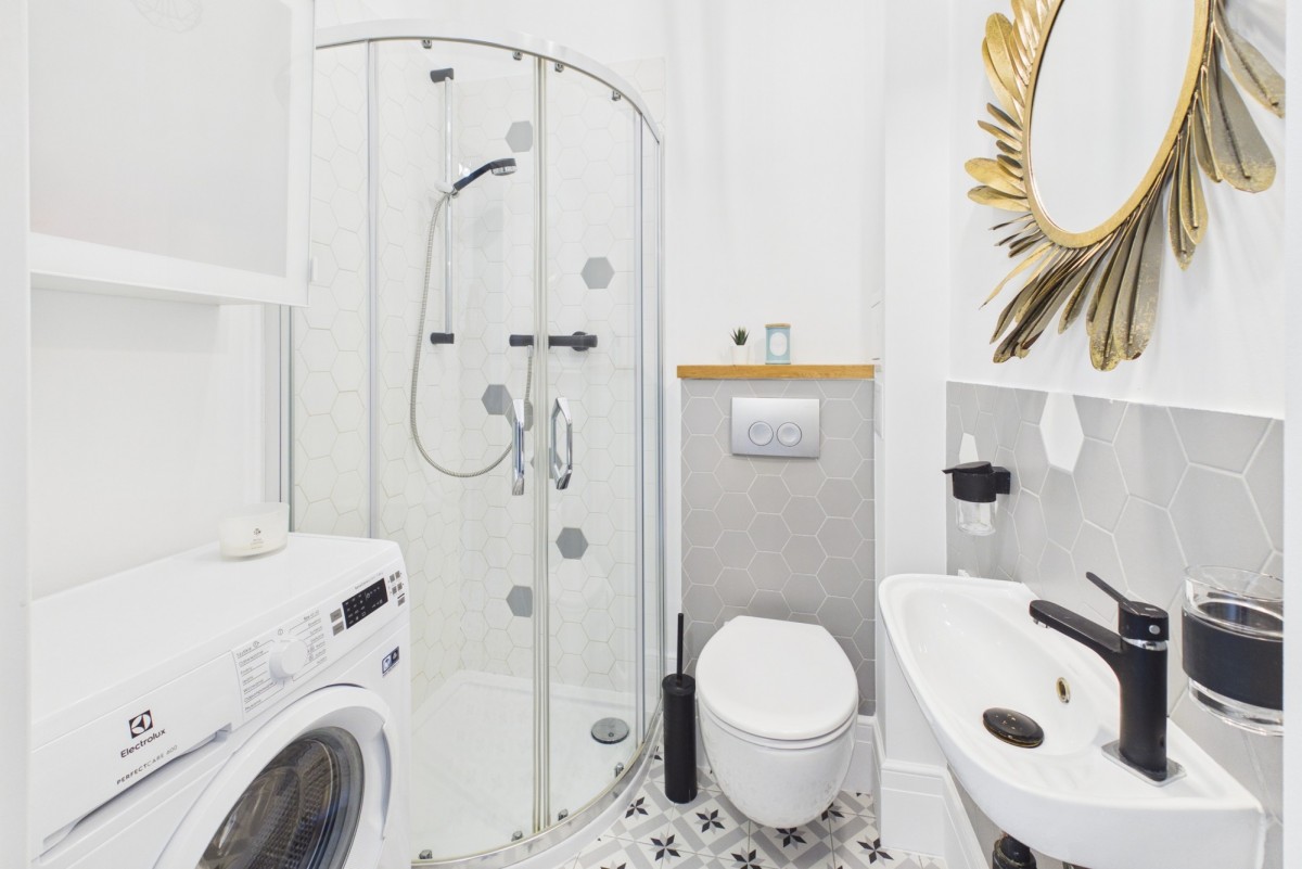 Łazienka z prysznicem, pralką, szafką oraz umywalką.