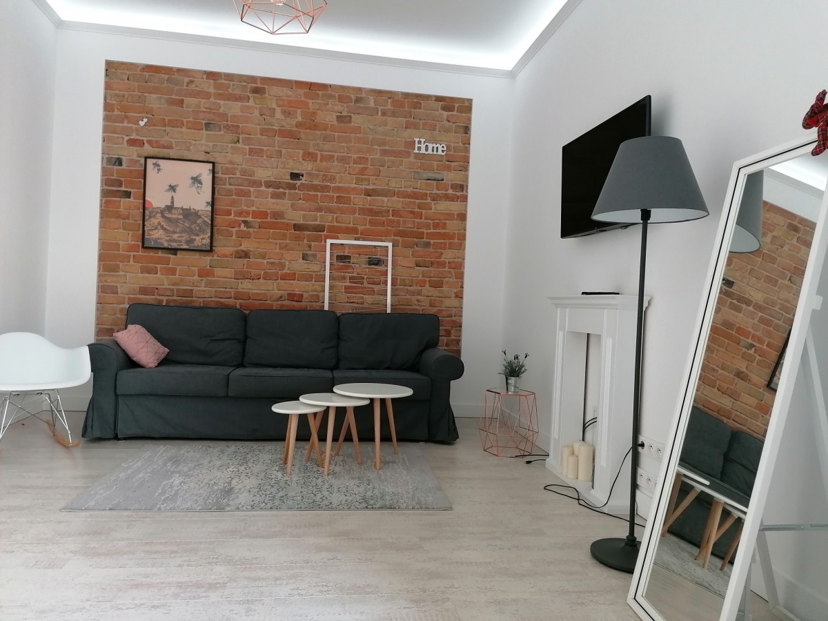 Mieszkanie zostało wykończone z dbałością o każdy detal. Wnętrze zachwyca połączeniem oryginalnej starej cegły z nowoczesnym designem.