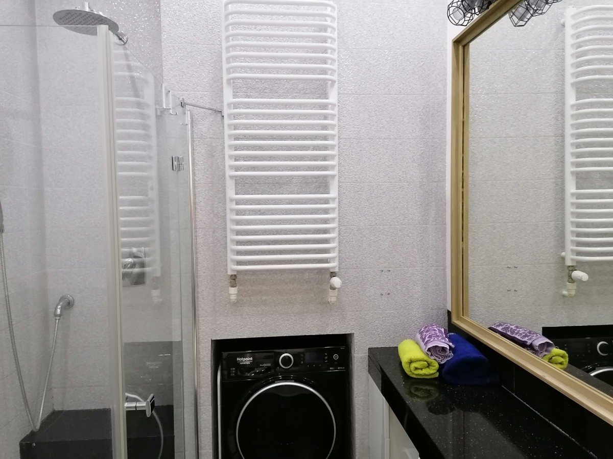 Łazienka: Nowoczesna, z komfortową kabiną prysznicową i WC, pralka.