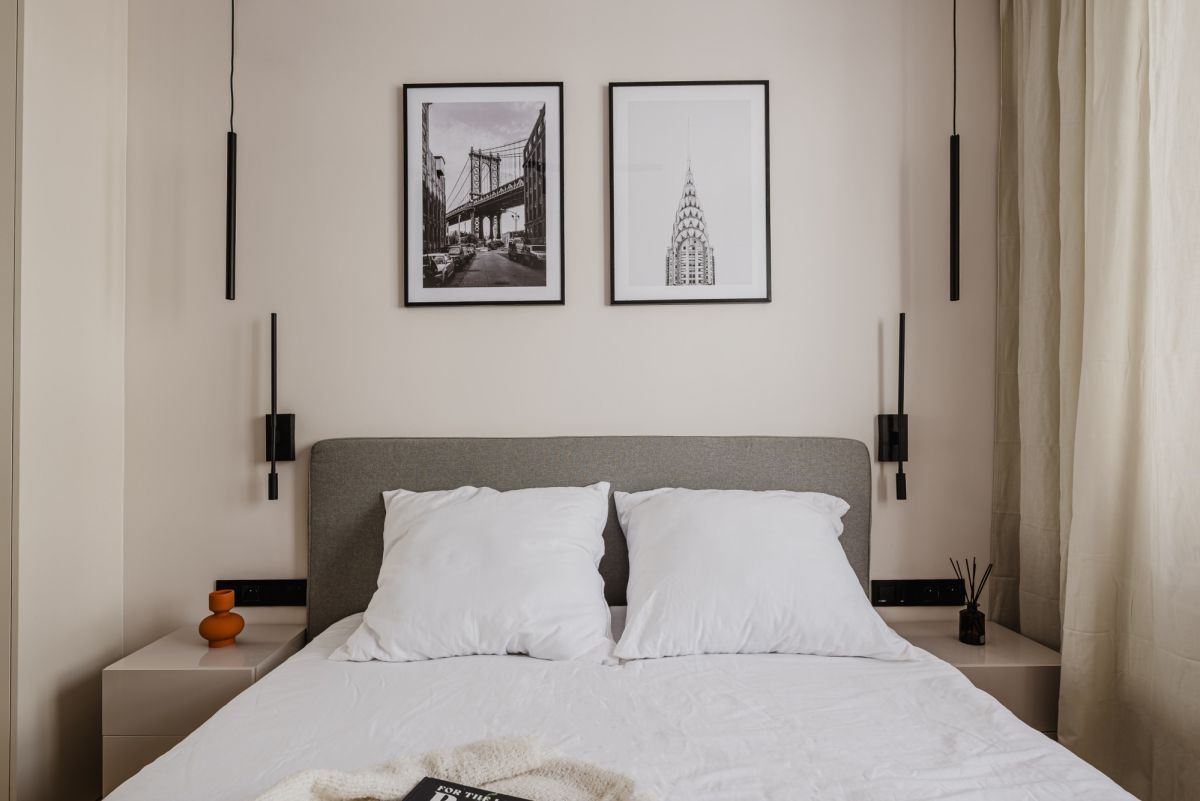 - komfortowa sypialnia: wyposażona w szerokie łóżko z drewnianym zagłówkiem i nastrojowe oświetlenie.